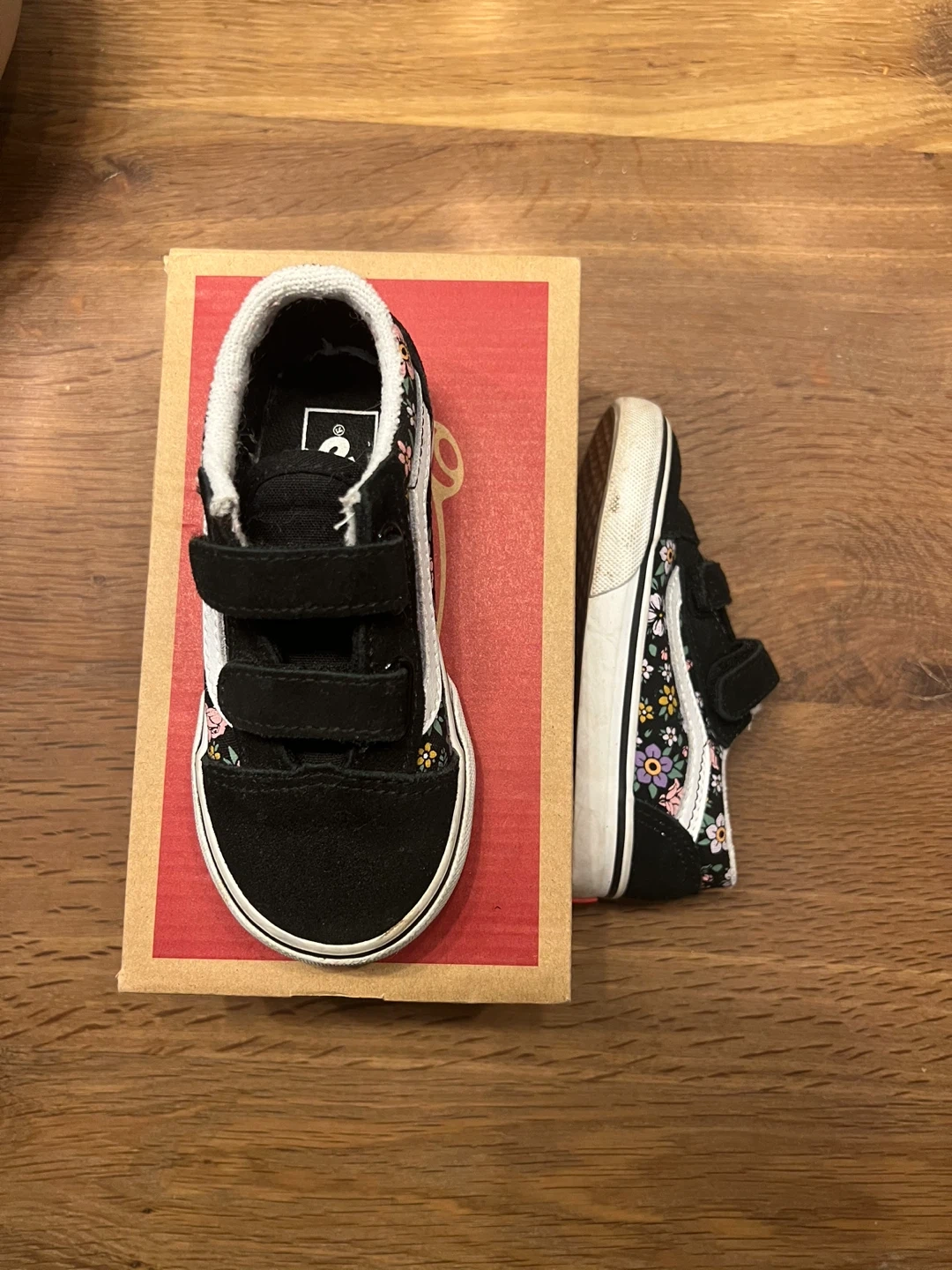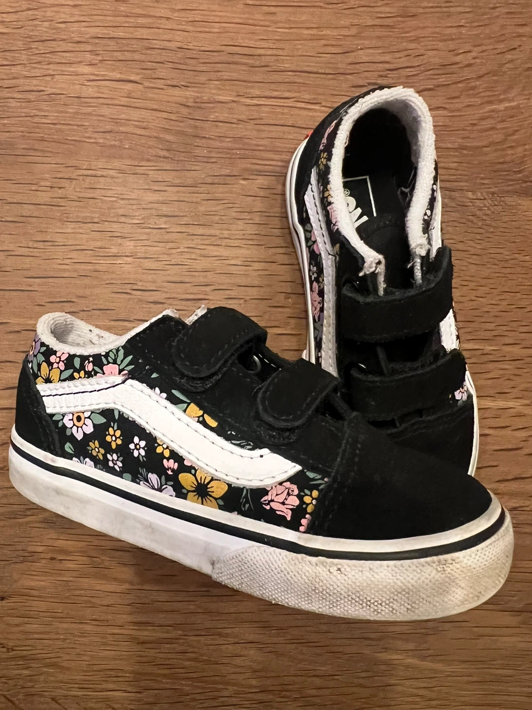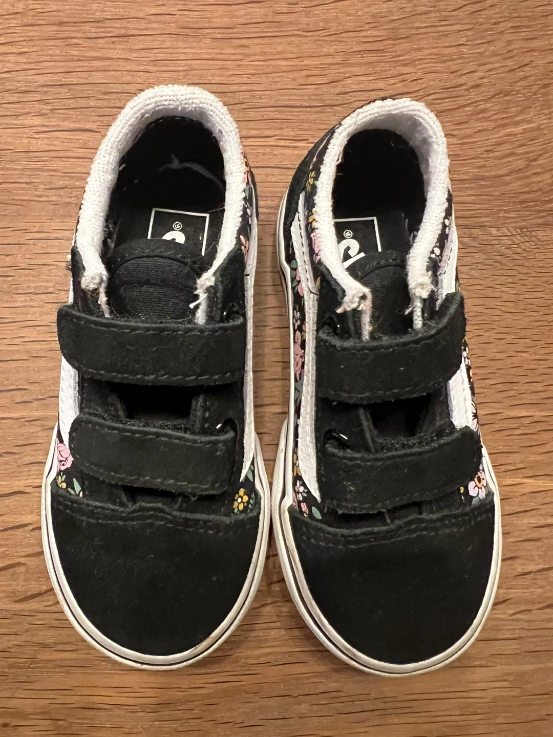 These gently used Vans Old Skool V sneakers come in a black "Fun Floral" pattern. They have velcro straps for easy on and off. Toddler size 8.0 T (UK 7.5, EUR 24.5) In original box.