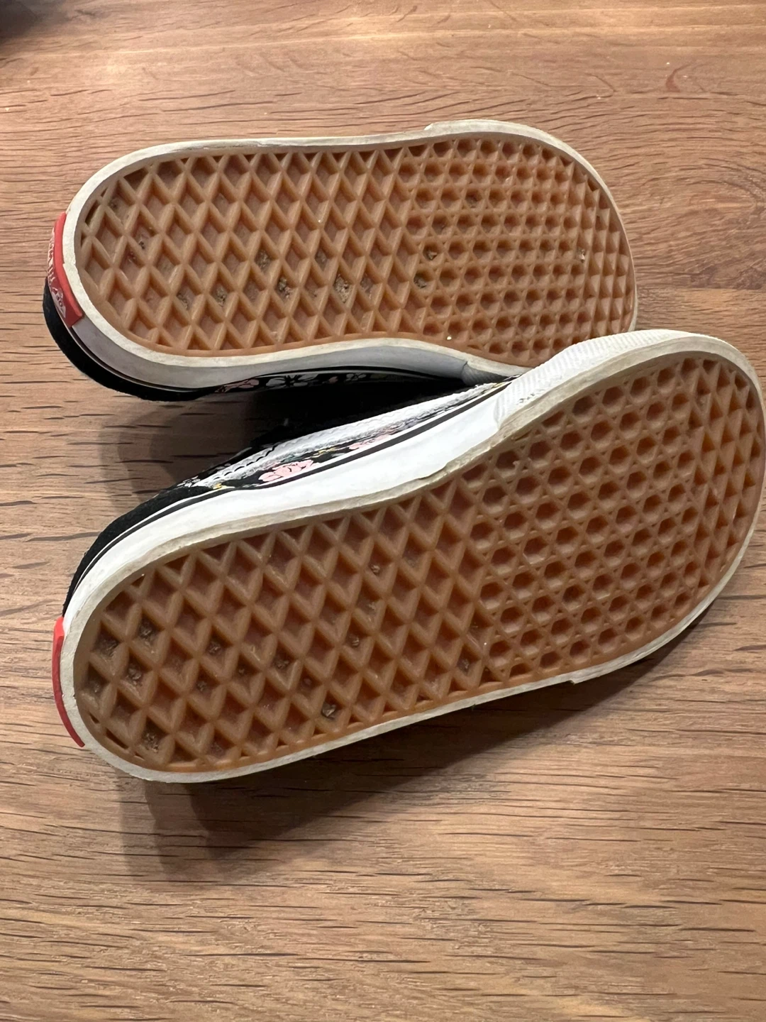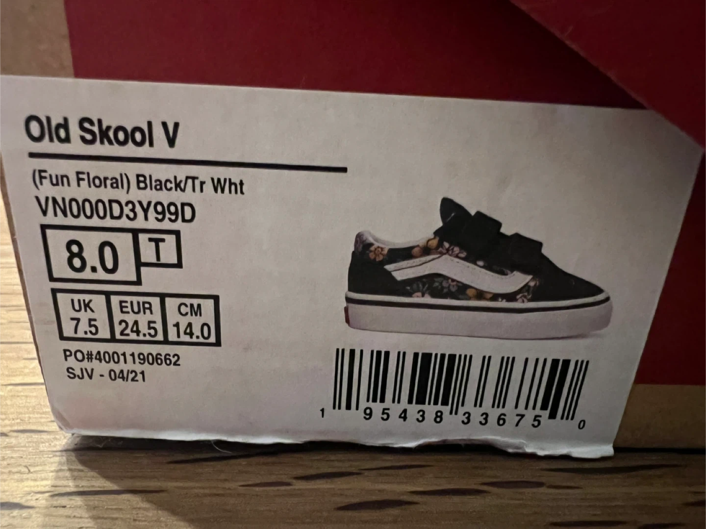 These gently used Vans Old Skool V sneakers come in a black "Fun Floral" pattern. They have velcro straps for easy on and off. Toddler size 8.0 T (UK 7.5, EUR 24.5) In original box.