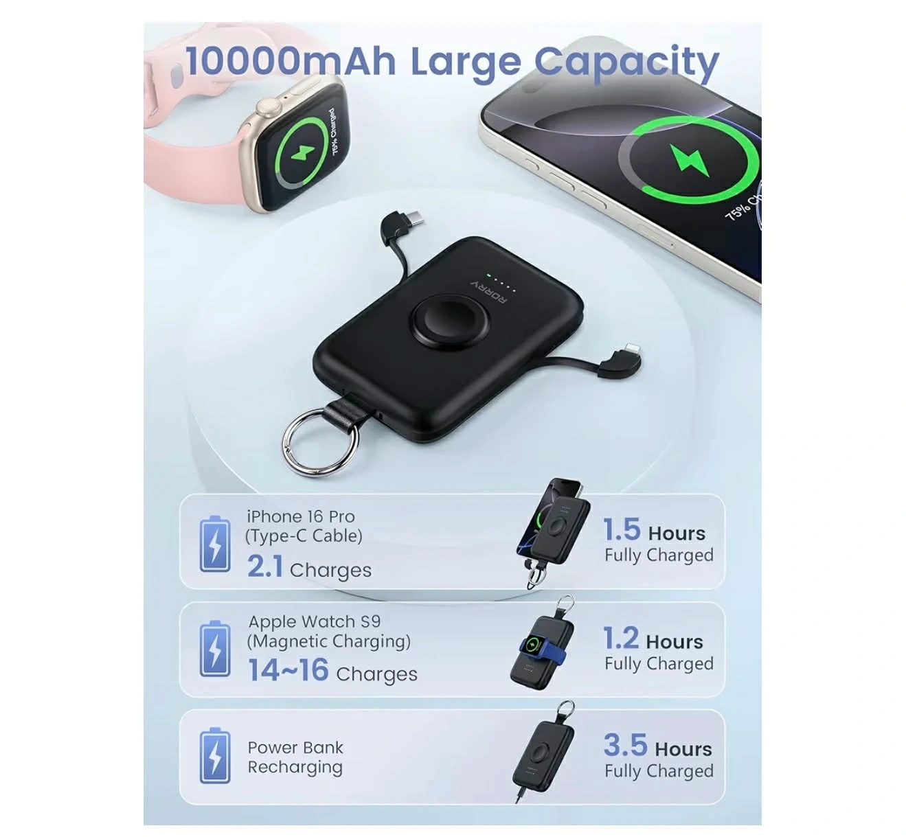 New RORRY Portable Charger, 10000mAh PD 20W Fast Charging Portable Charger Power Bank with Built in Cables, Travel Battery Pack for iPhone 17/16/15/14/13/12 and Apple Watch Ultra11/10/9/8/7/6/5,