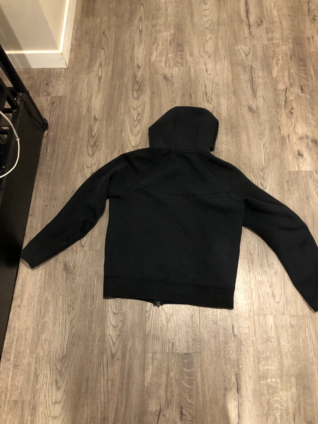 Black Nike Tech Fleece full-zip hoodie. It's got zippered pockets and a fitted hood. Comfortable and lightweight for everyday wear.