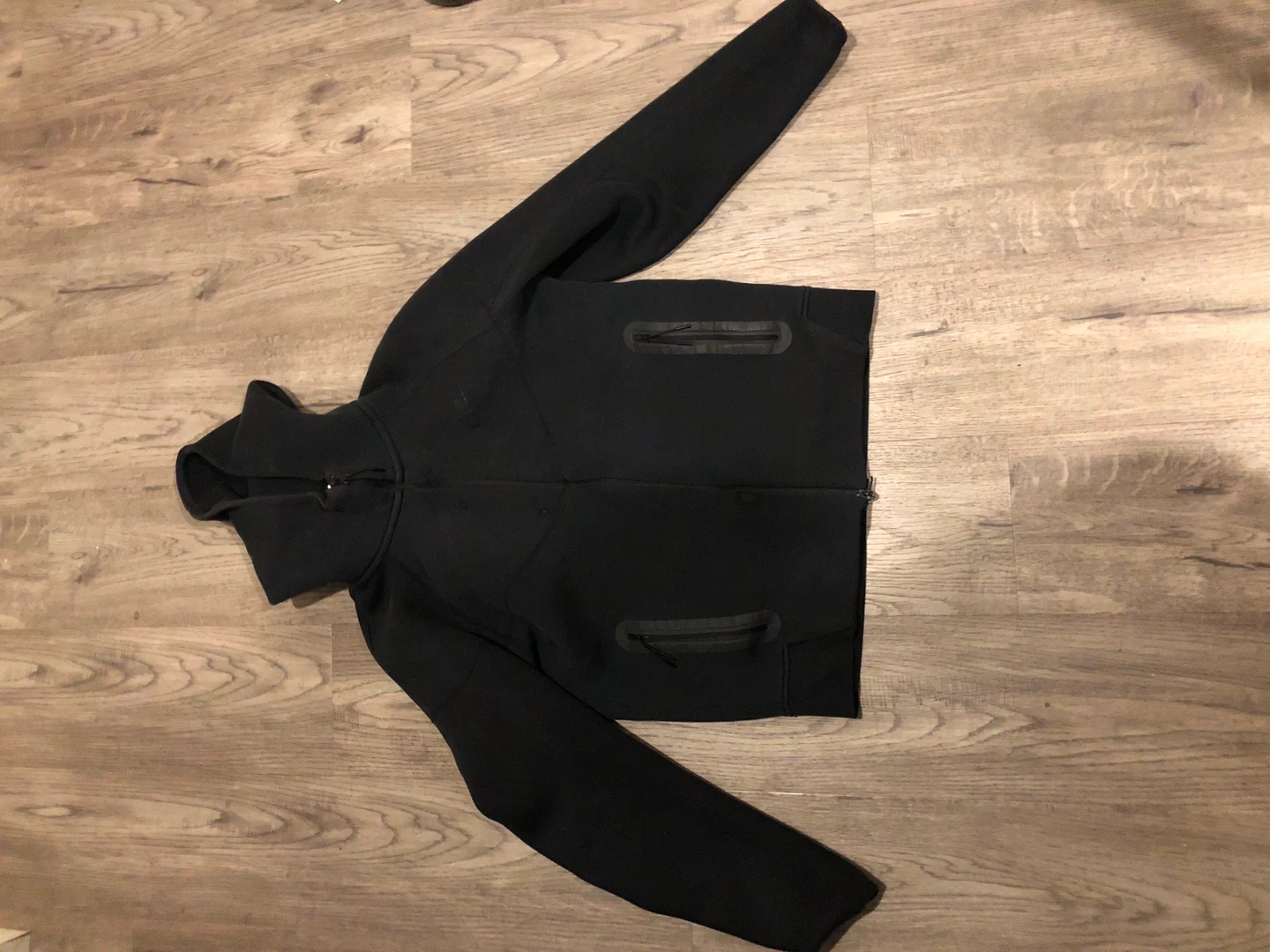 Black Nike Tech Fleece full-zip hoodie. It's got zippered pockets and a fitted hood. Comfortable and lightweight for everyday wear.