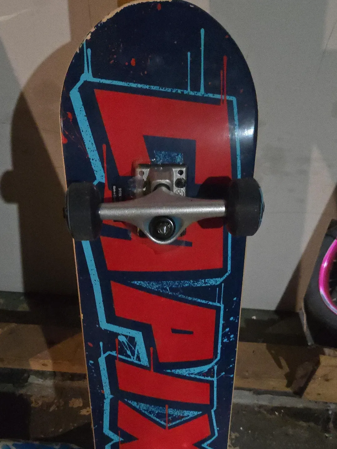 This skateboard features a bold red and blue graffiti-style design. It's ready for some cruising or tricks! It's a great way to get around town or hit the skate park.
