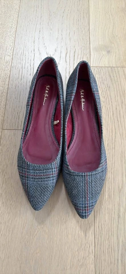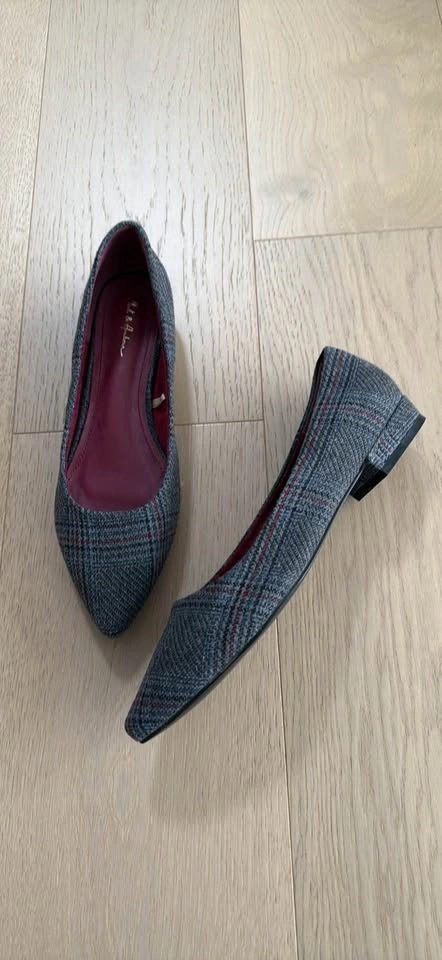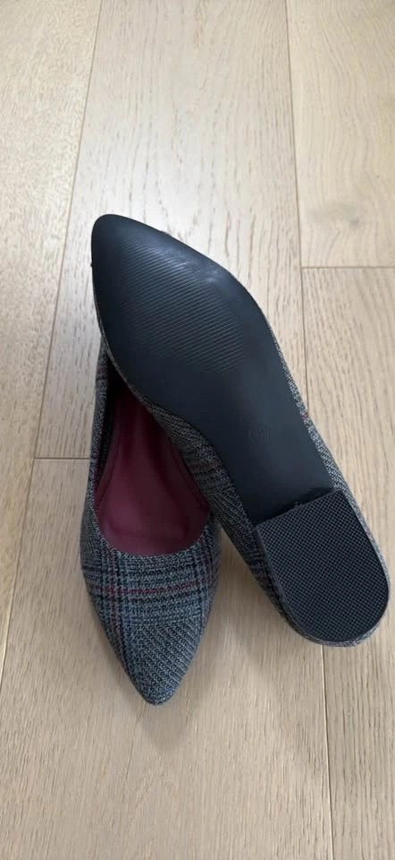 Never worn. A pair of grey checker pointed toe flats with regular styling and closed back detail. Features a synthetic upper, cushioned footbed, and textured, patterned outsole. Size UK8 (fits foot length 26.5 cm). Material: synthetic. Sole material: rubber. Wipe with a clean, dry cloth to remove dust.