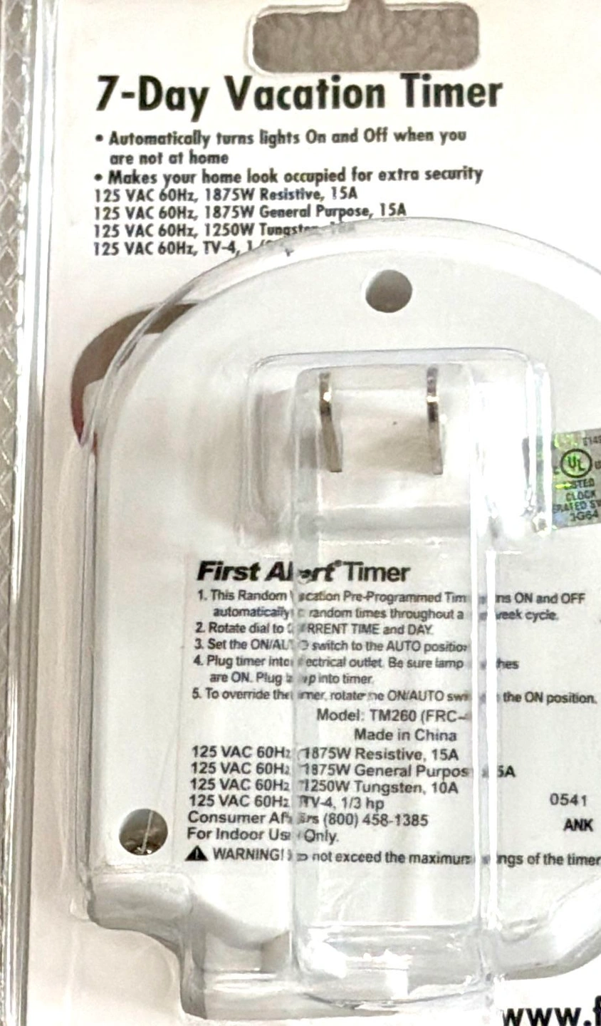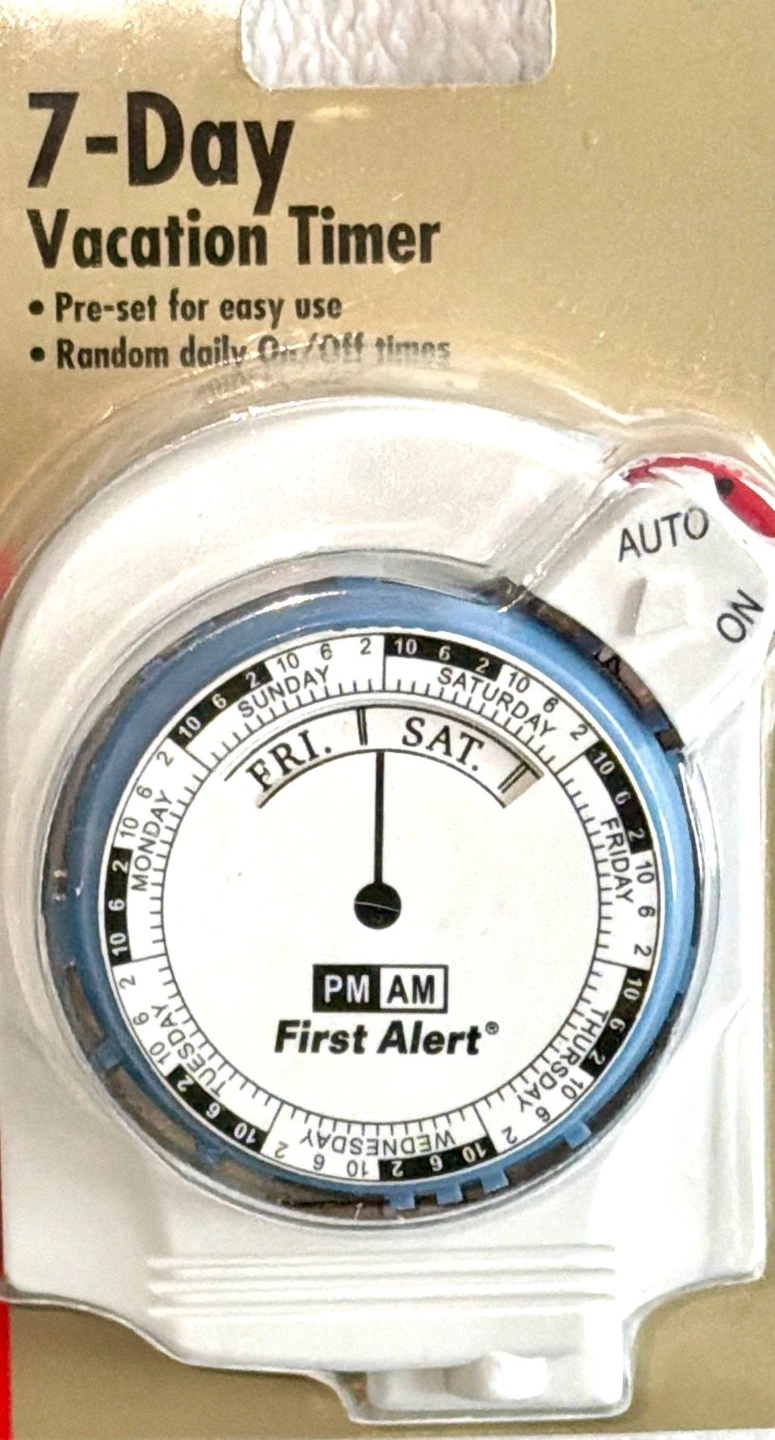 First Alert 7-Day Vacation Timer, model TM260. This is a mechanical timer designed to turn lights on and off to give the impression that a home is occupied while the residents are away. Pre-set for easy use and has a random daily on/off feature. Enhances home security by automating lights to deter theft. Auto and On Button, Outlet on bottom, Plug into Outlet. Also perfect for holiday or seasonal lighting! Or for any lights you want to illuminate on a timer. Operating instructions included. New in sealed package. Cash only sale. No holds. Buyer must pick up in the Morton Grove Area. Thank you.