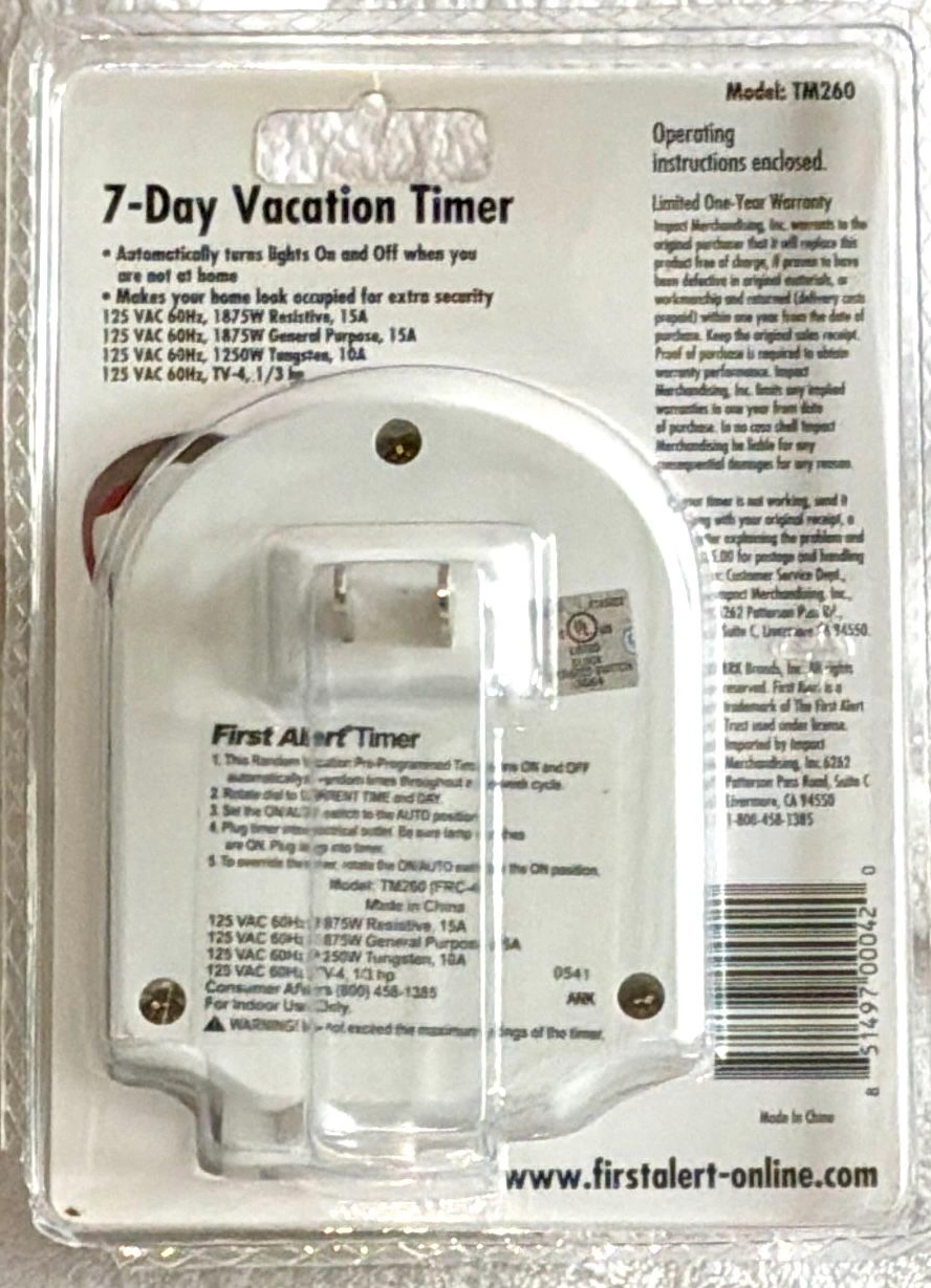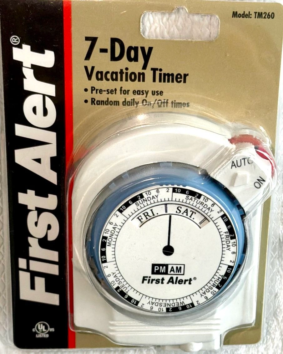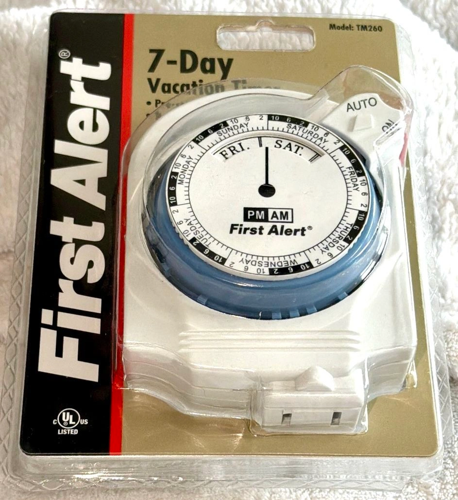 First Alert 7-Day Vacation Timer, model TM260. This is a mechanical timer designed to turn lights on and off to give the impression that a home is occupied while the residents are away. Pre-set for easy use and has a random daily on/off feature. Enhances home security by automating lights to deter theft. Auto and On Button, Outlet on bottom, Plug into Outlet. Also perfect for holiday or seasonal lighting! Or for any lights you want to illuminate on a timer. Operating instructions included. New in sealed package. Cash only sale. No holds. Buyer must pick up in the Morton Grove Area. Thank you.