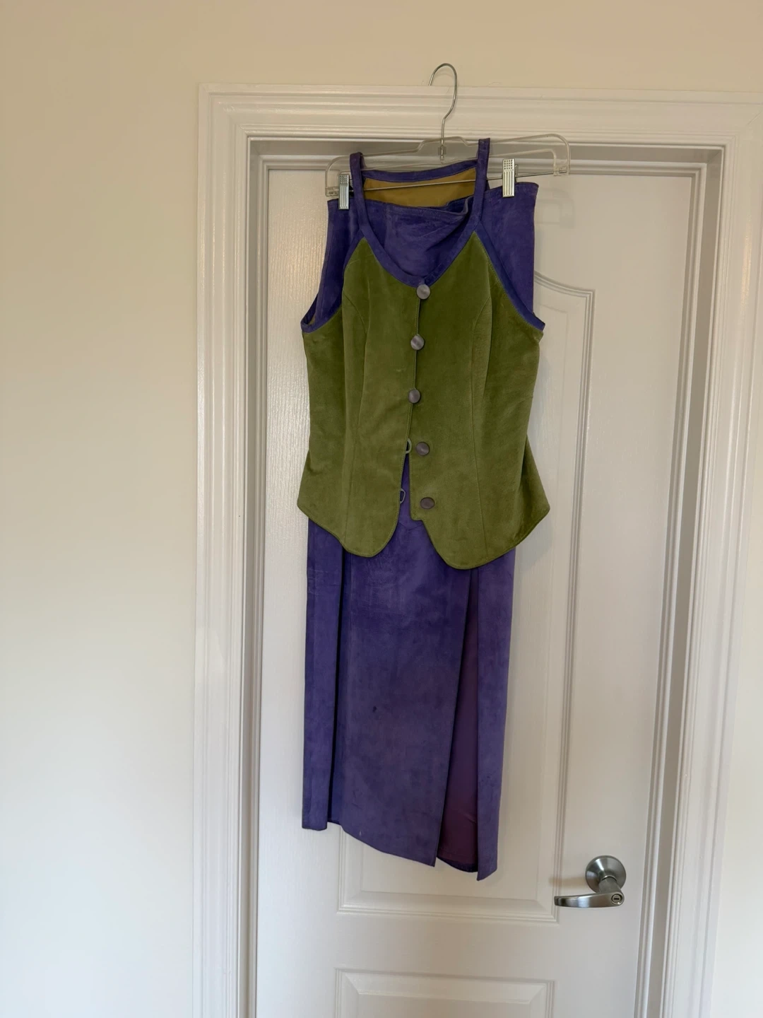 A unique vintage two-piece set featuring a purple suede skirt and a green suede vest. The vest has a button-up front and contrasting trim. This set would be a fun addition to a retro wardrobe or for costume use!