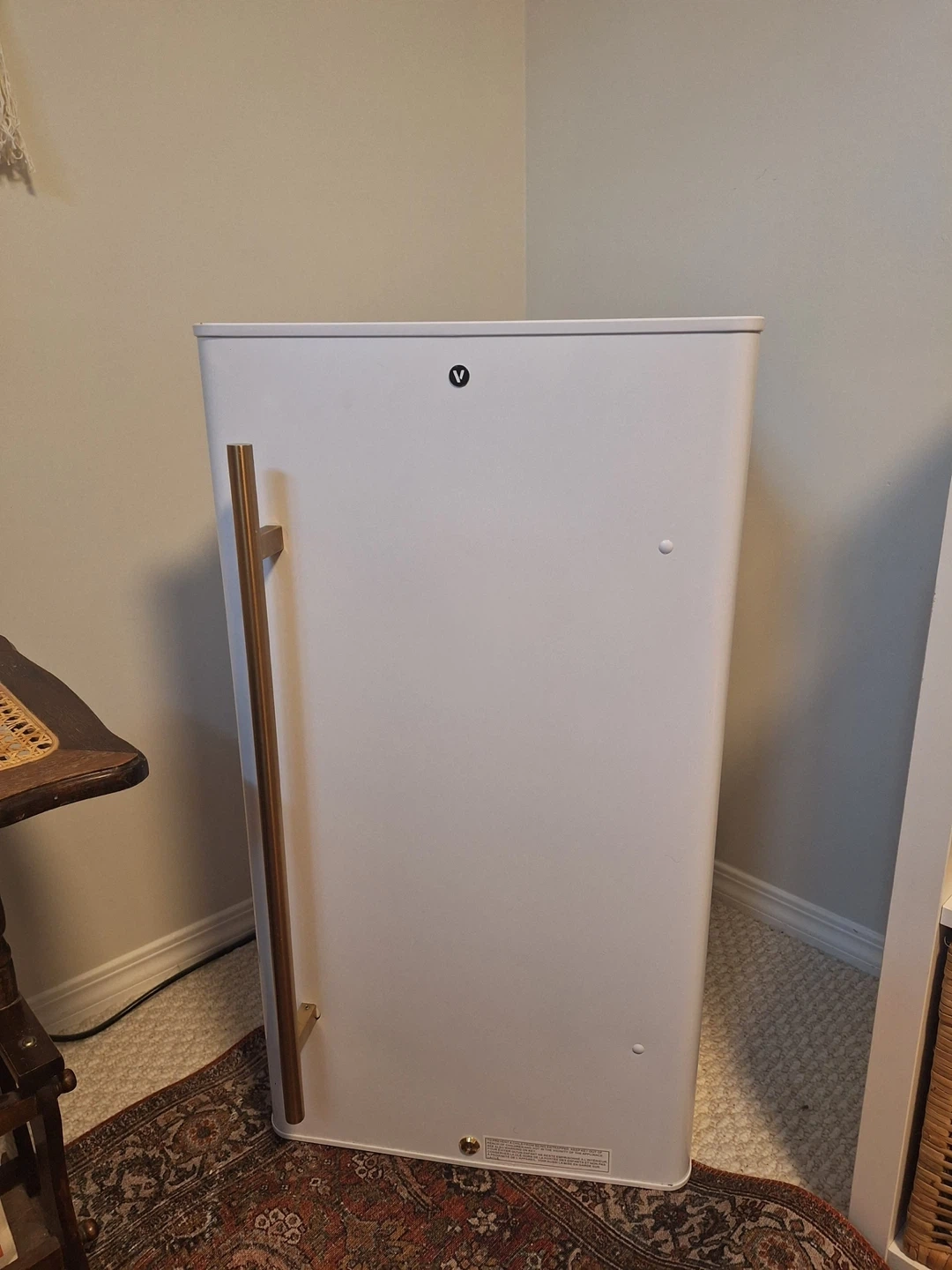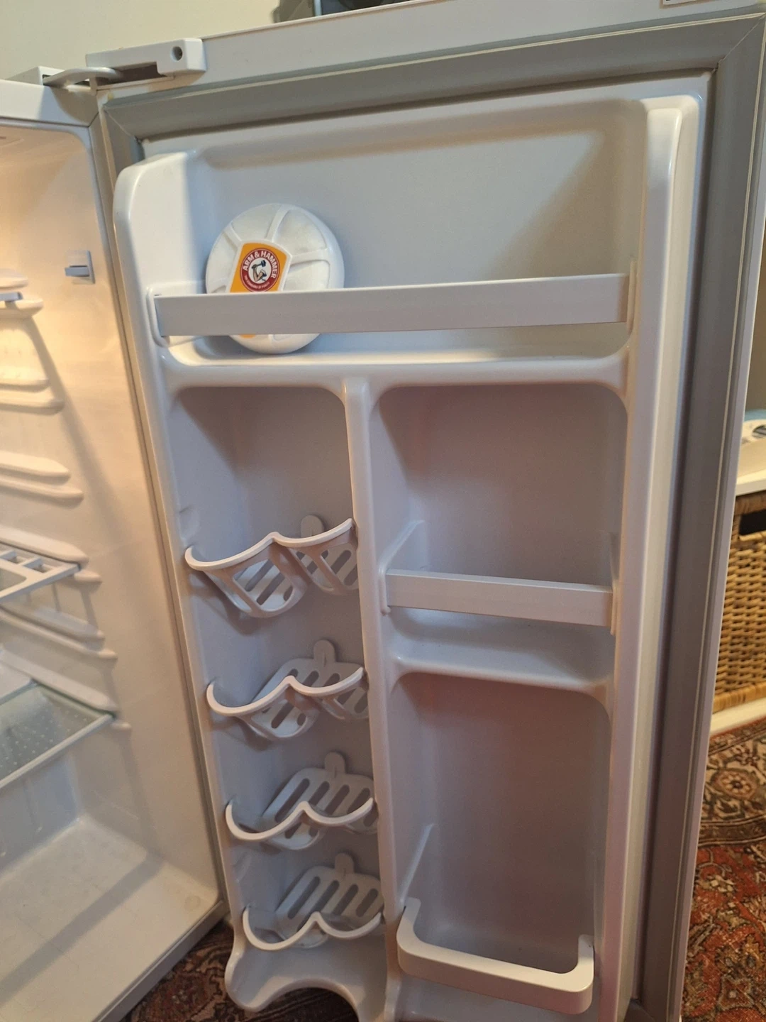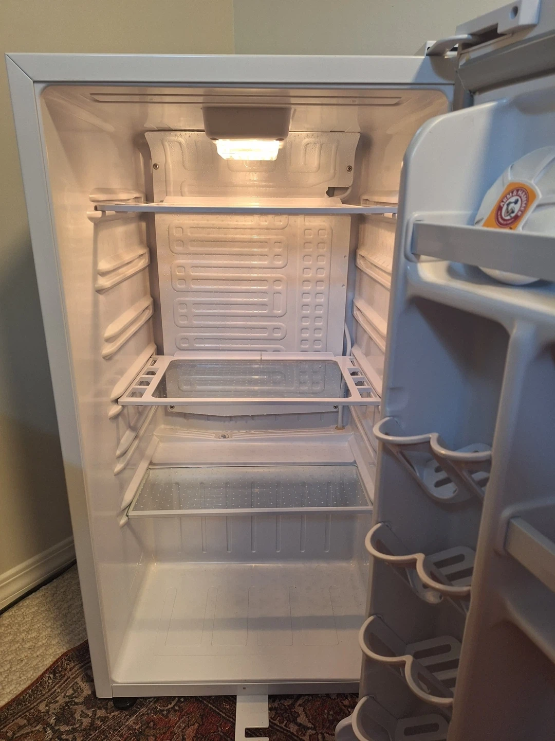 Compact white refrigerator with adjustable shelves and door storage. Includes an Arm & Hammer fridge freshener. Perfect for a dorm room or small apartment!
