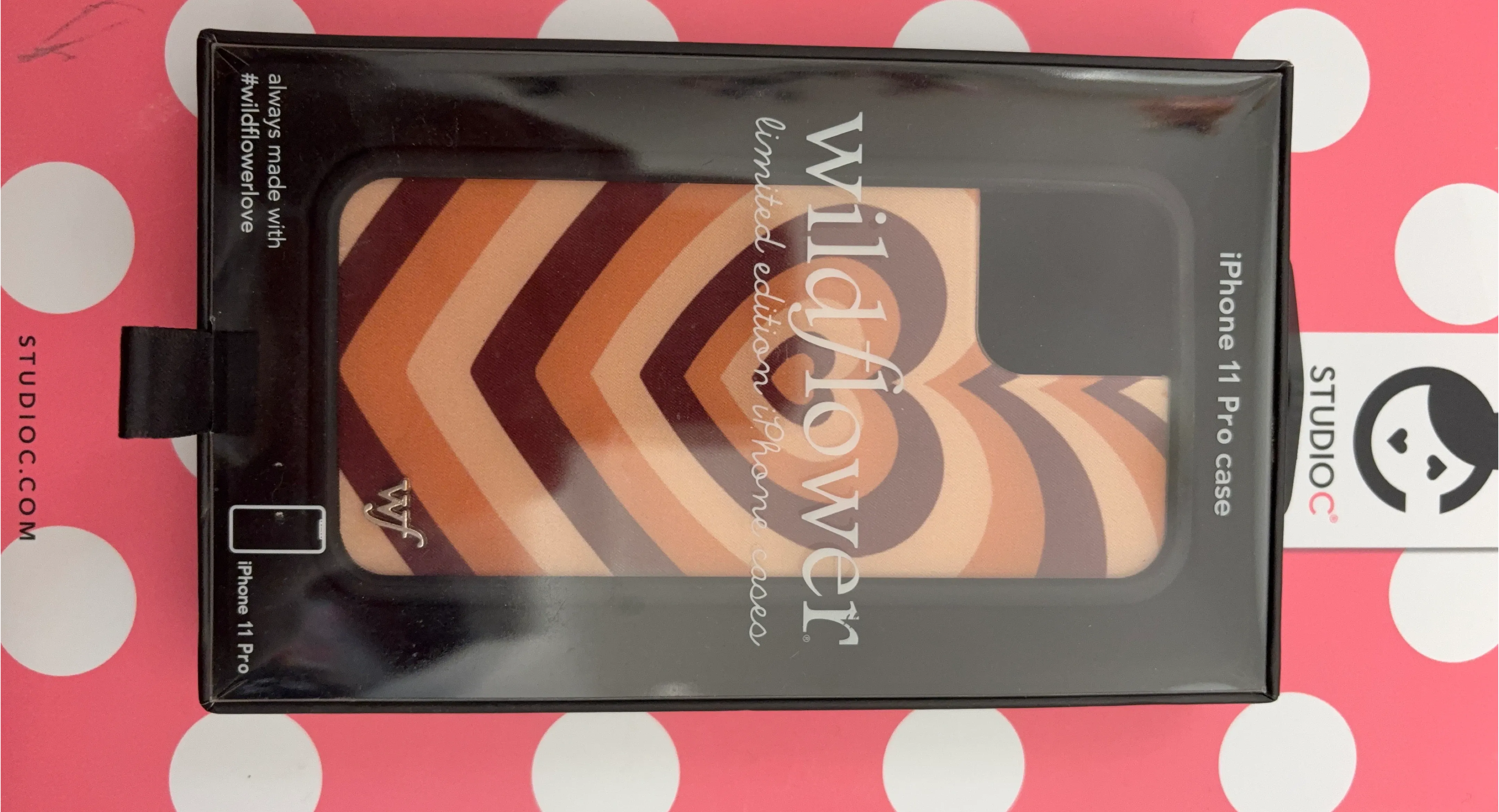 This is a limited edition Wildflower phone case designed for the iPhone 11 Pro. It features a unique heart pattern in warm, retro colours. The case comes in its original packaging.