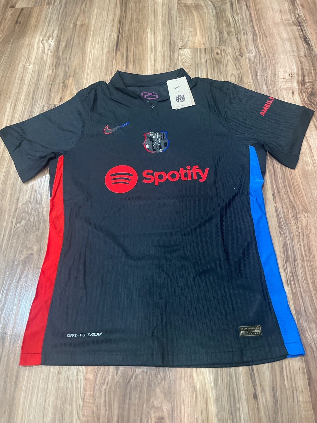 This is the FC Barcelona 2023-24 home jersey. It features the Spotify sponsorship and Nike Dri-FIT ADV technology. The jersey is primarily black with red and blue side panels.