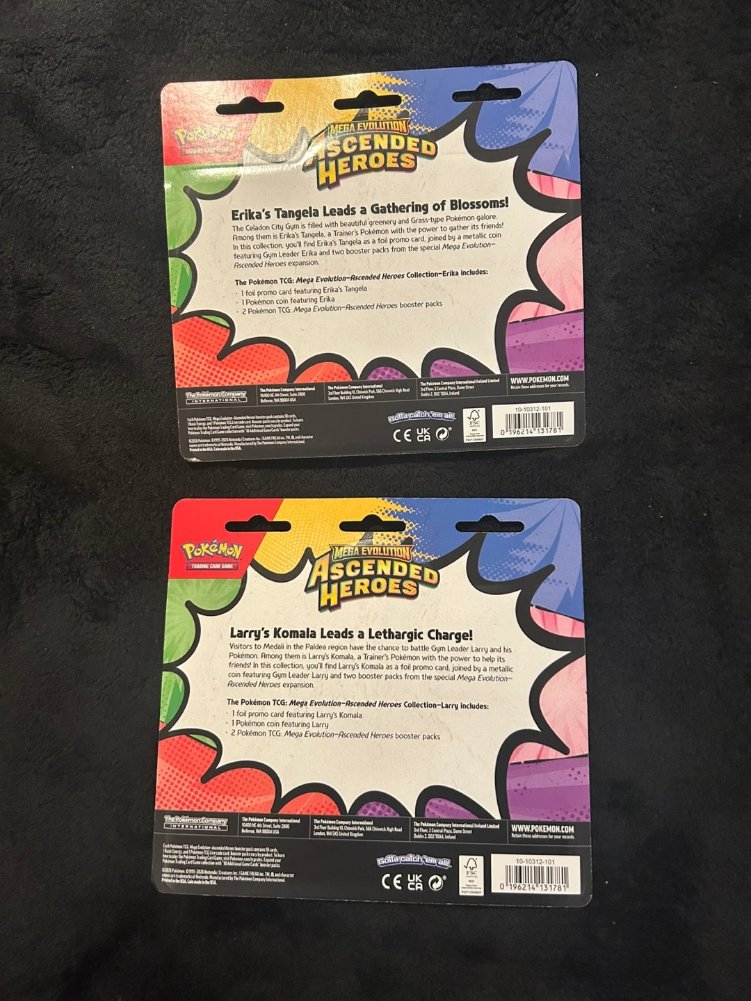 Includes one promo card and two booster packs from the special Mega Evolution Ascended Heroes set for each collection. These are the Erika's Tangela and Larry's Komala collections. They're great for any Pokémon fan looking to expand their collection! $40 each