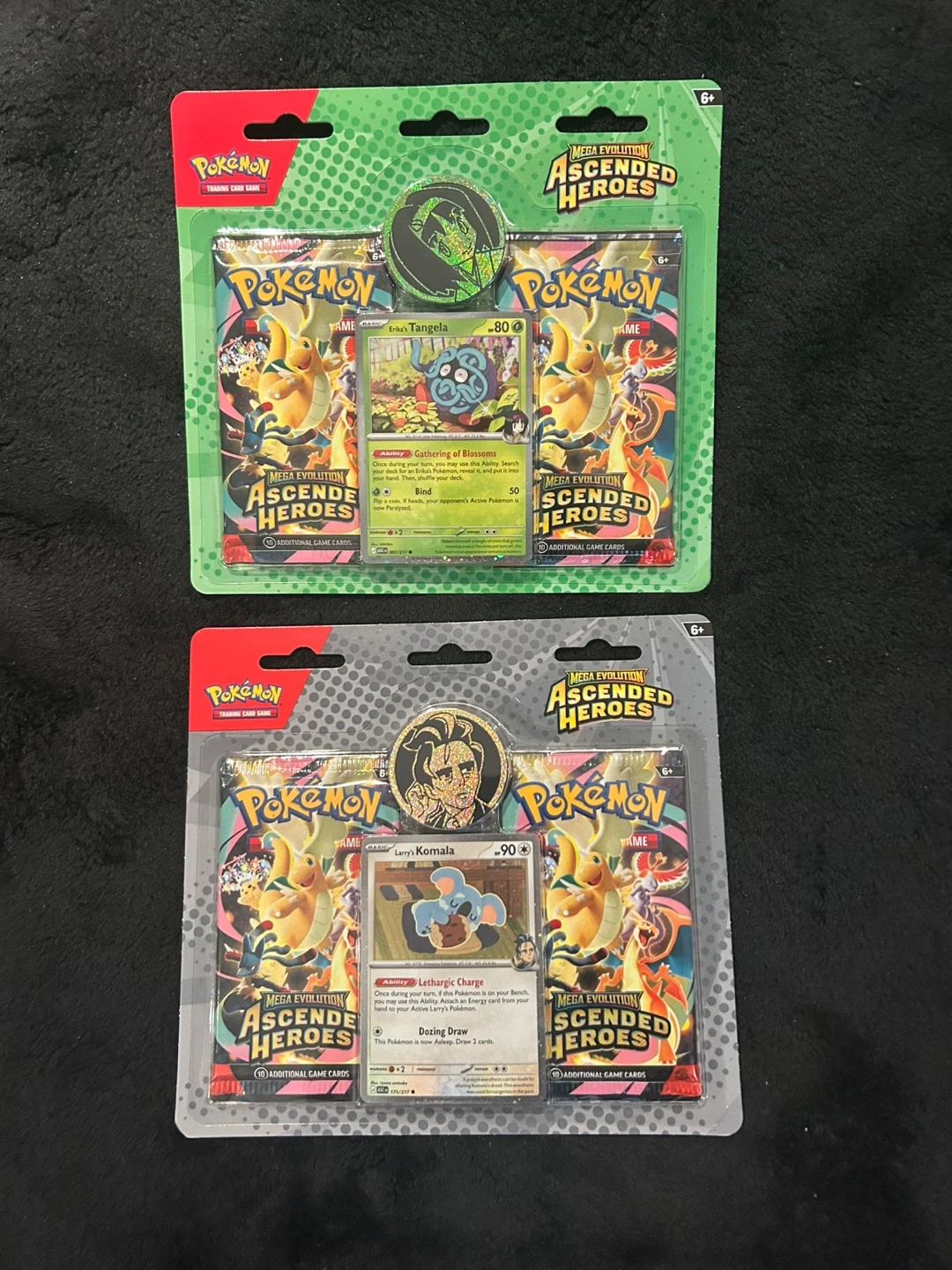 Includes one promo card and two booster packs from the special Mega Evolution Ascended Heroes set for each collection. These are the Erika's Tangela and Larry's Komala collections. They're great for any Pokémon fan looking to expand their collection! $40 each