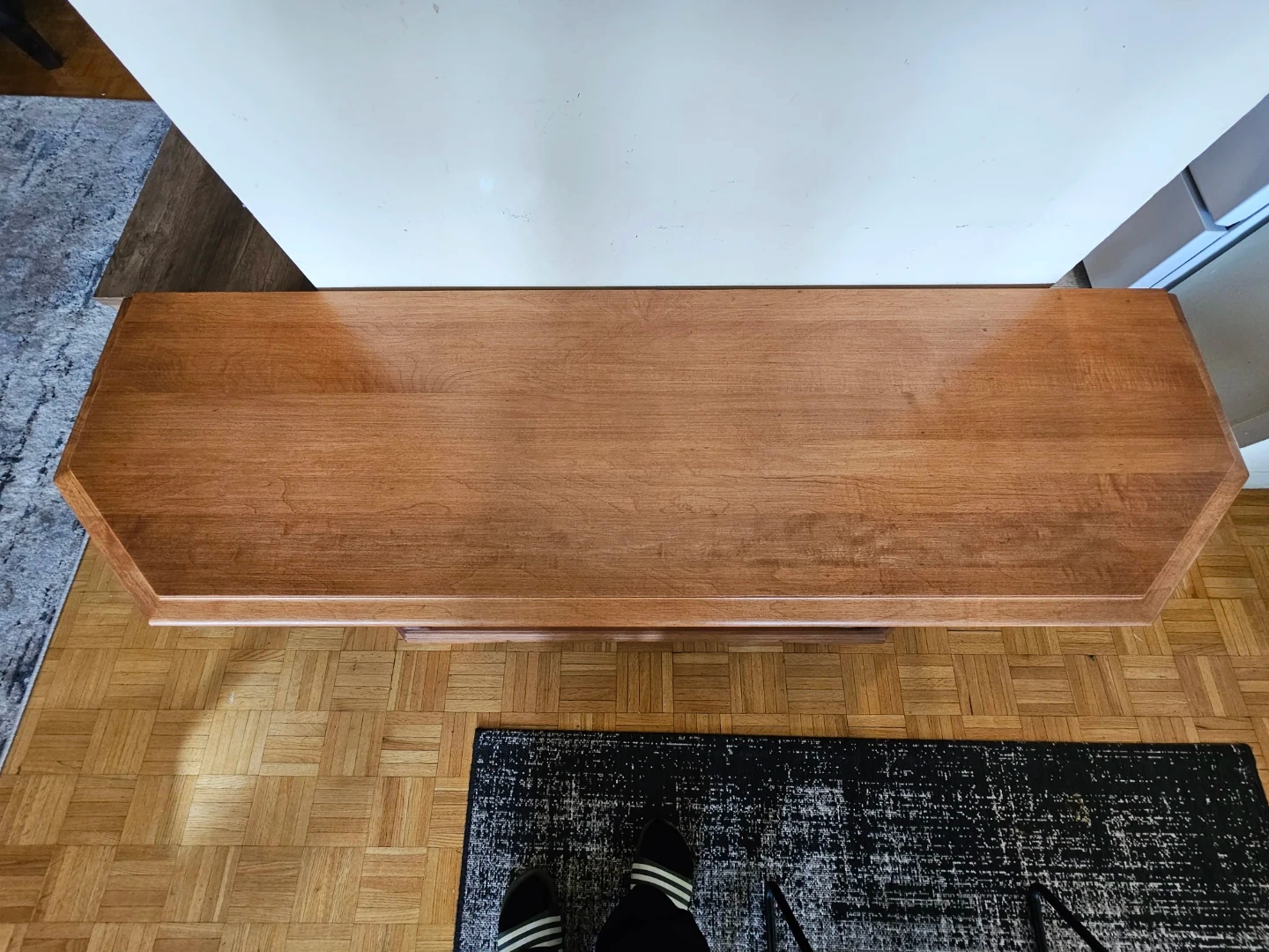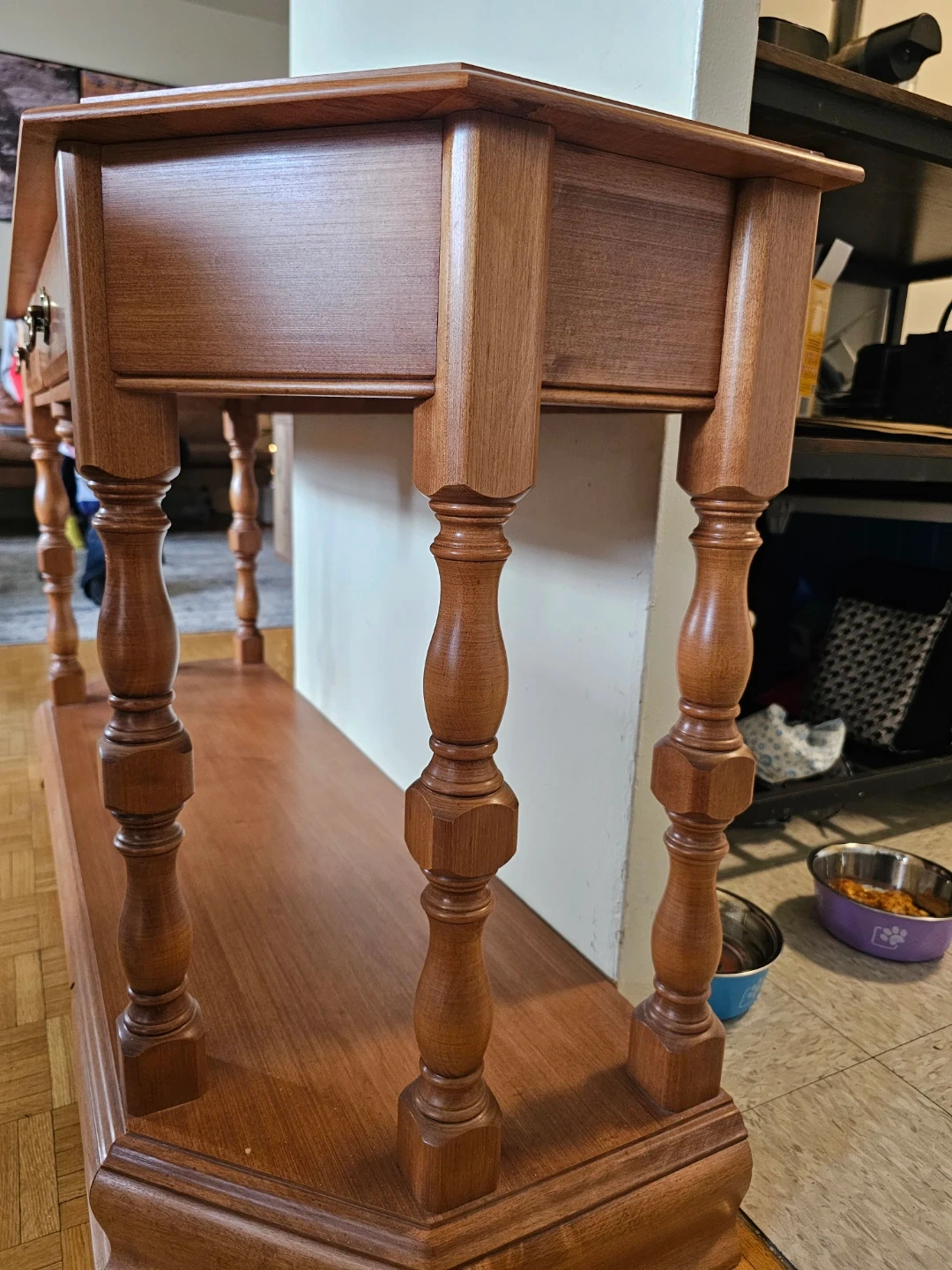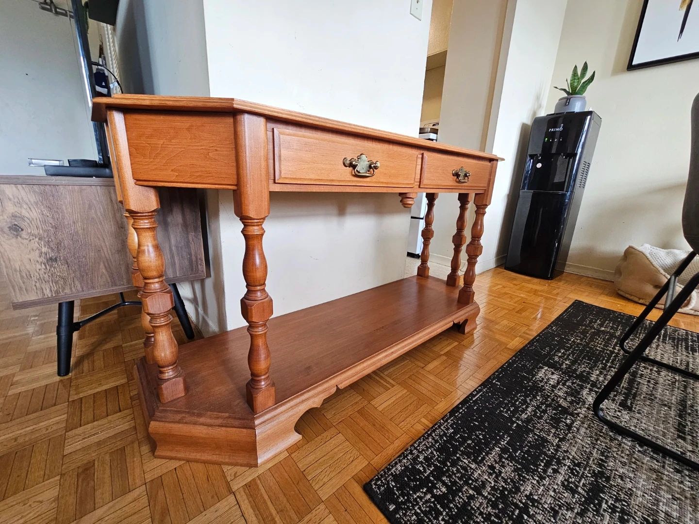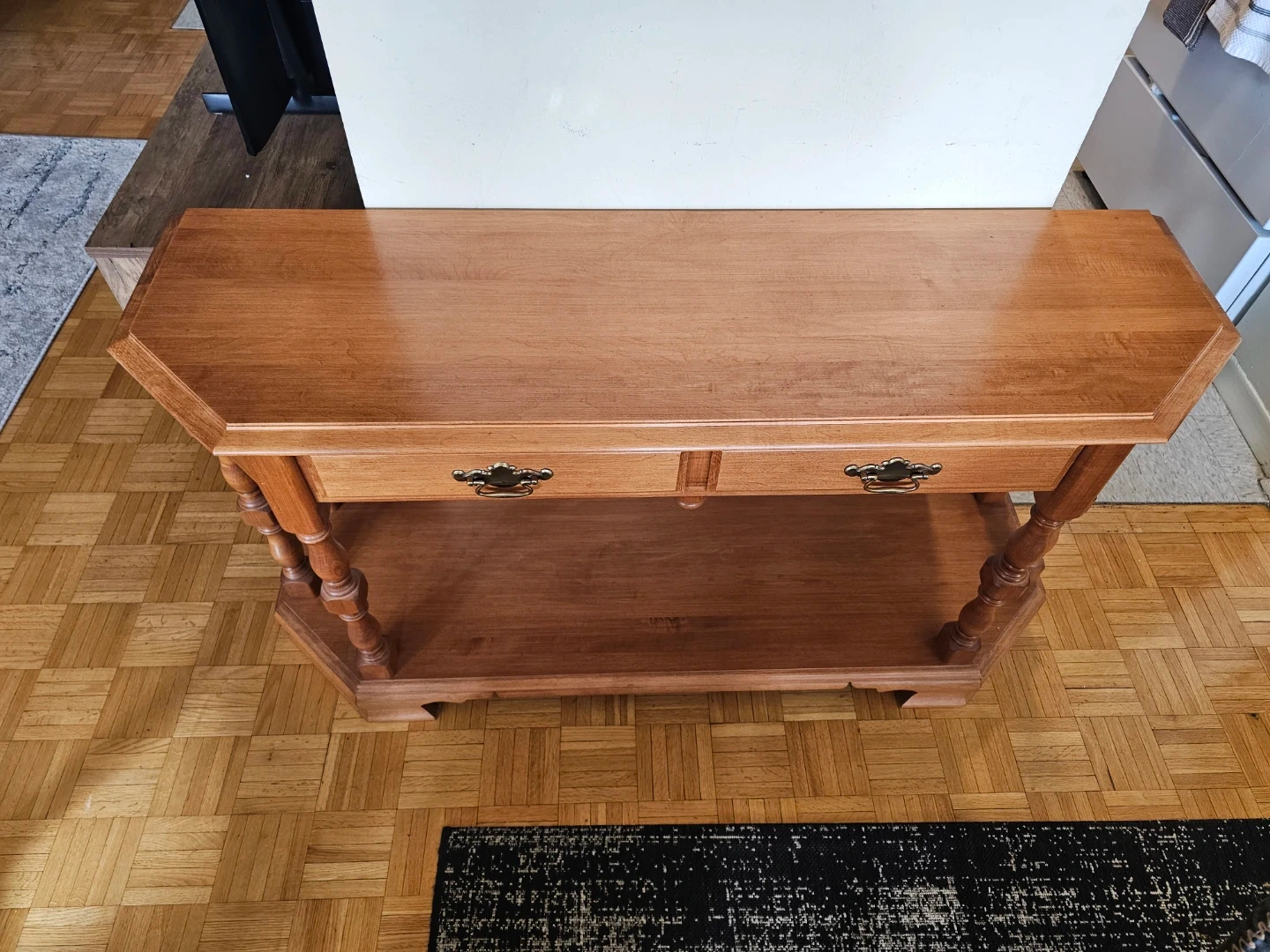 A lovely wooden console table, perfect for an entryway or hallway! It features two drawers for storage and a lower shelf for displaying items. The table is in great condition and has a warm, inviting look that would complement any decor.