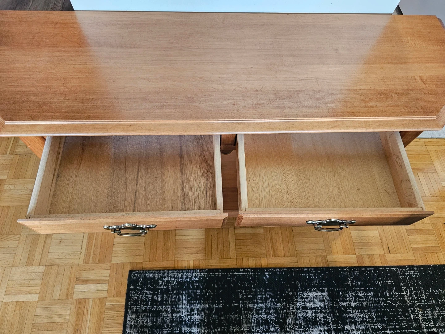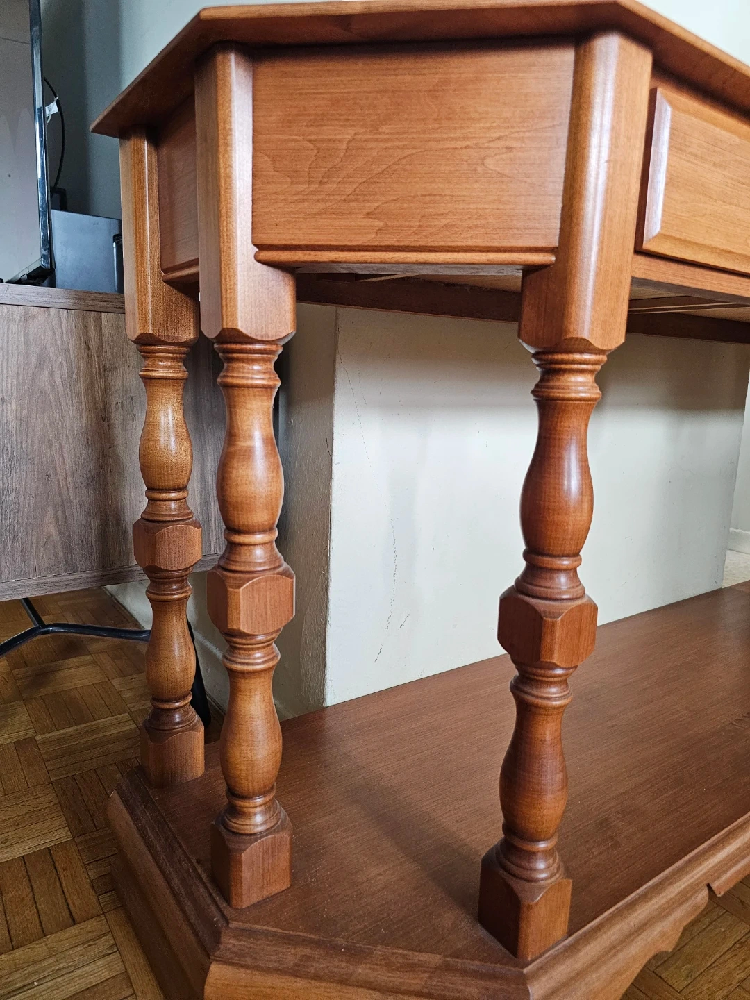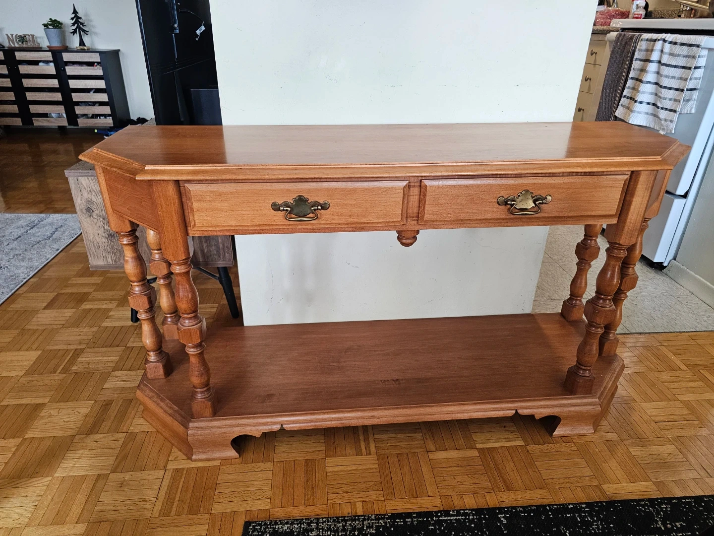 A lovely wooden console table, perfect for an entryway or hallway! It features two drawers for storage and a lower shelf for displaying items. The table is in great condition and has a warm, inviting look that would complement any decor.