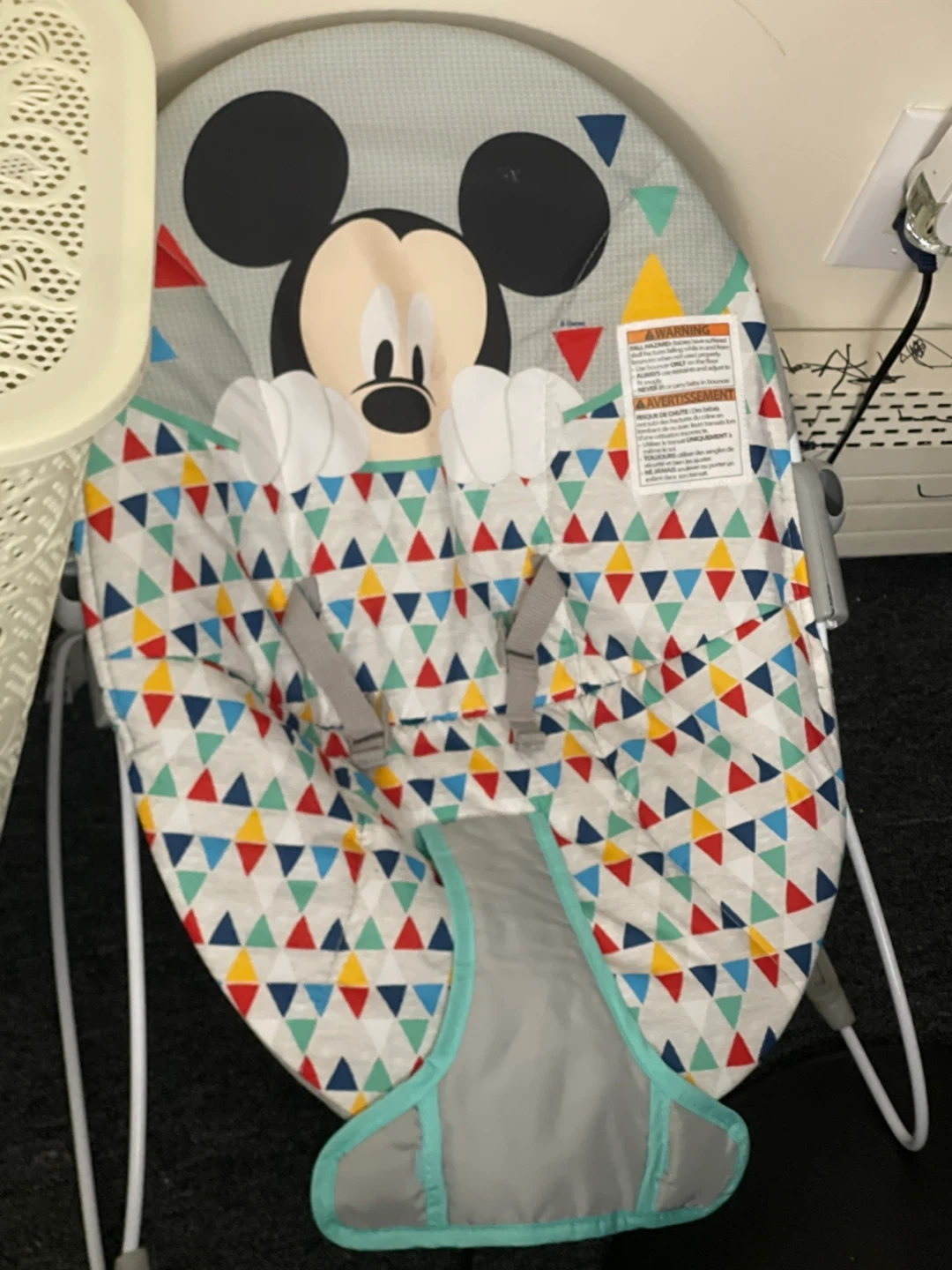 Selling a baby bouncer with a fun Mickey Mouse design! It features a colorful geometric pattern and a comfortable seat for your little one. This bouncer is perfect for keeping your baby entertained and relaxed