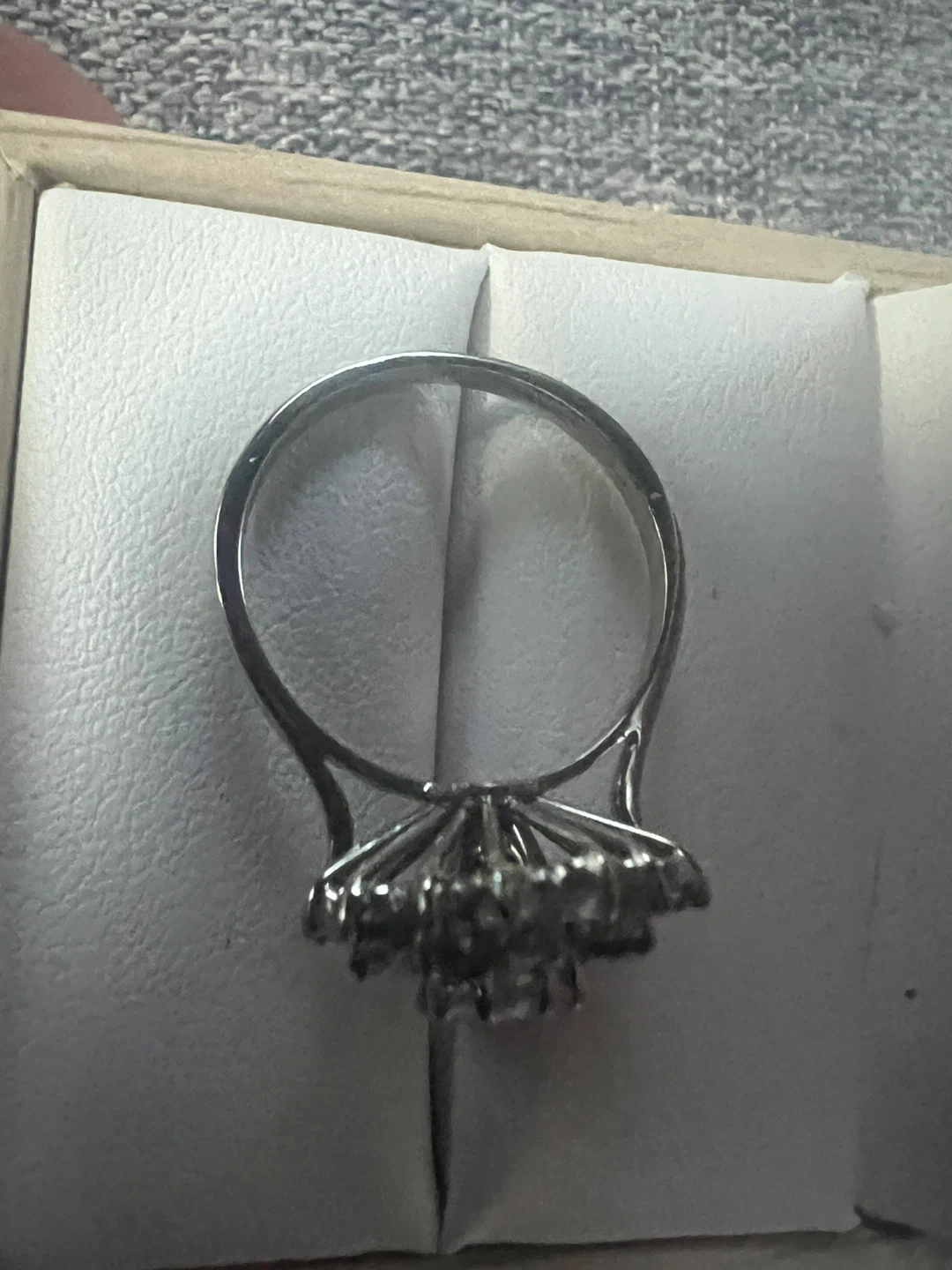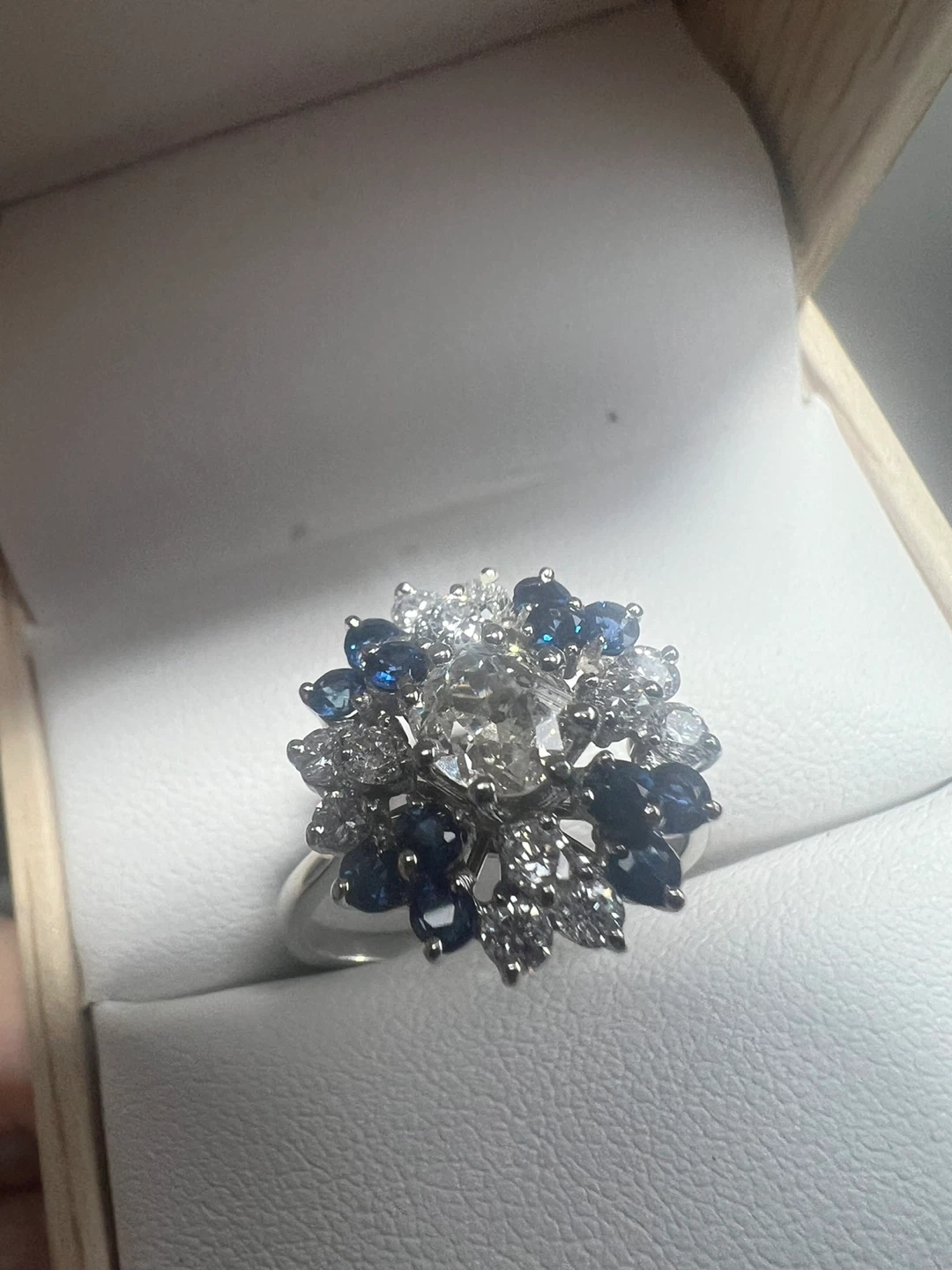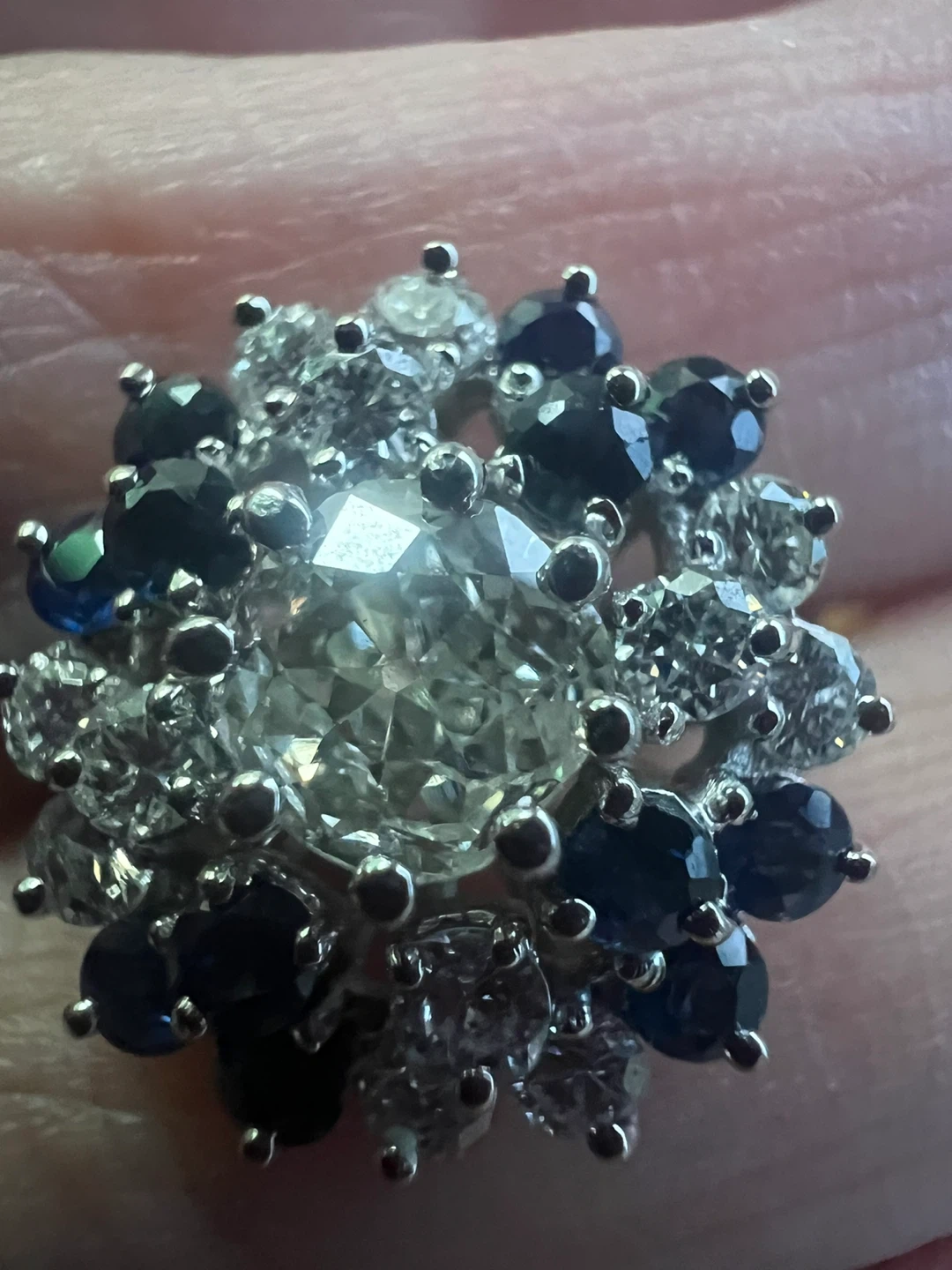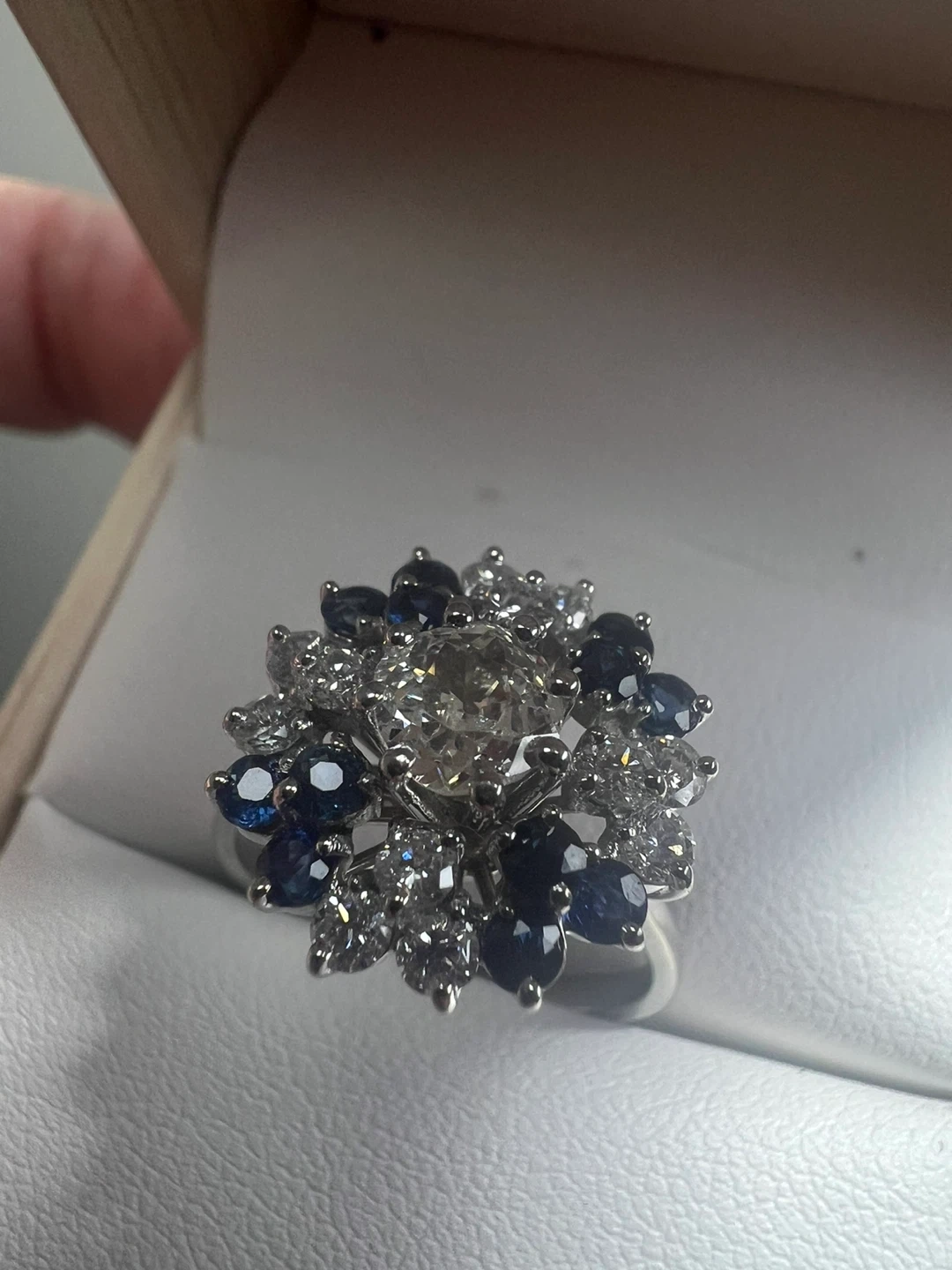 Beautiful 18 k white gold diamond and sapphire cluster ring. Set in 18 k gold, it features a central diamond 0.50 carat surrounded by a halo of smaller diamonds and blue sapphires. This ring is a real statement piece!