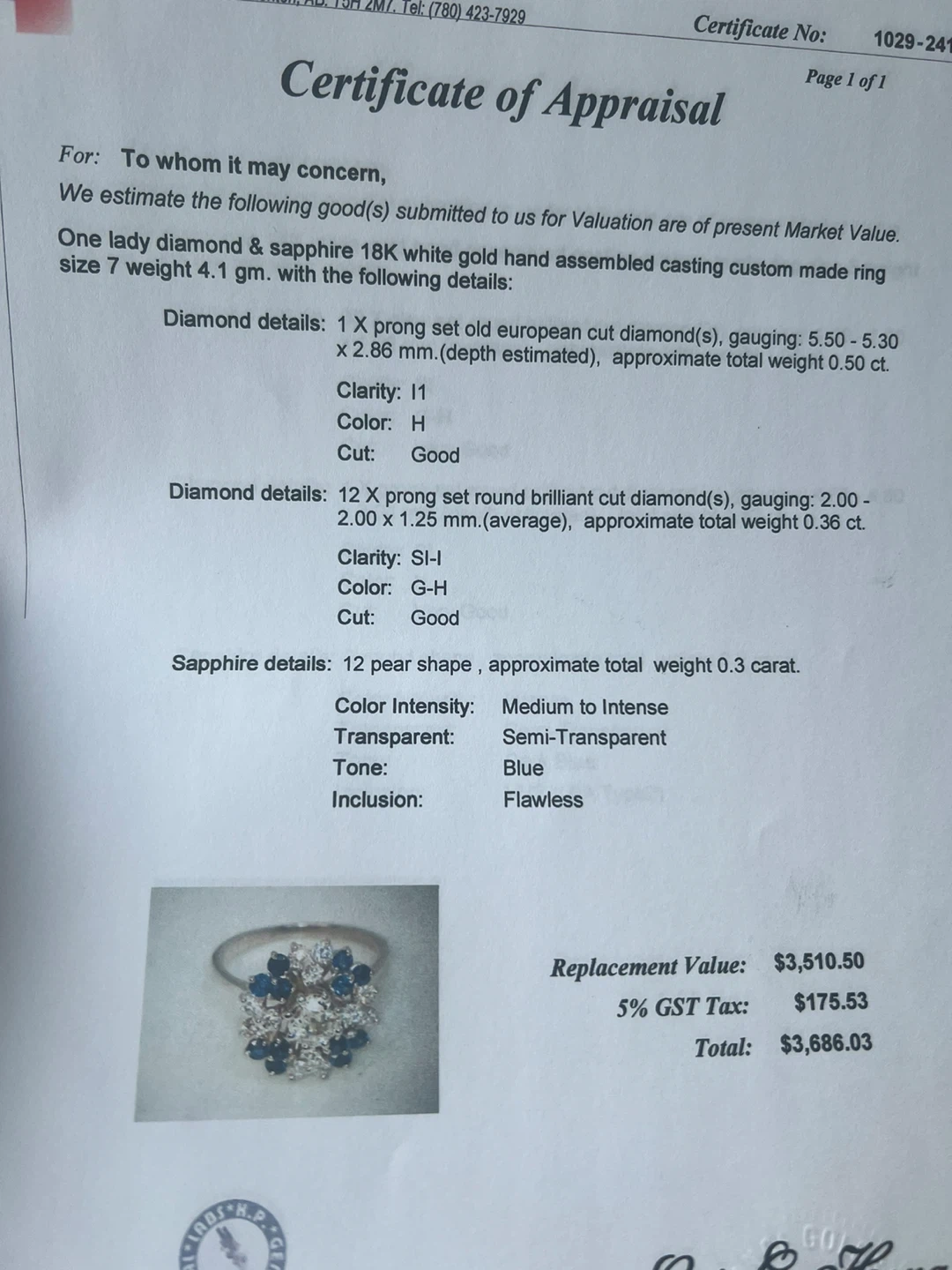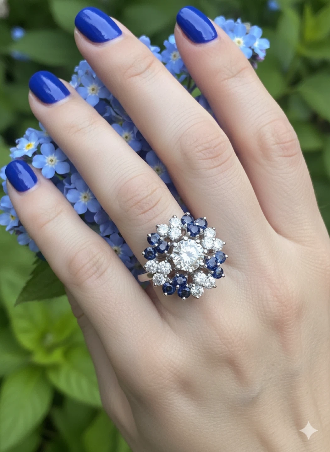 Beautiful 18 k white gold diamond and sapphire cluster ring. Set in 18 k gold, it features a central diamond 0.50 carat surrounded by a halo of smaller diamonds and blue sapphires. This ring is a real statement piece!
