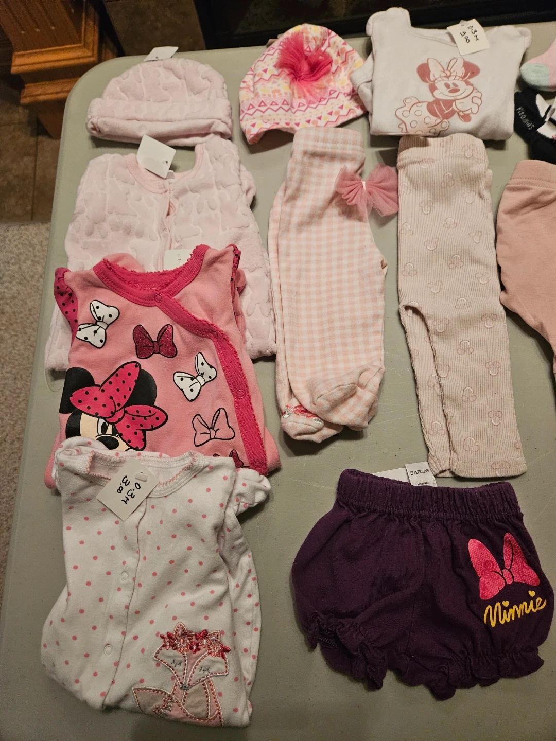 This lot includes a variety of baby girl clothing items featuring Disney's Minnie Mouse and DC Comics' Batgirl. It has onesies, pants, a romper, and socks, perfect for keeping a little one cozy and stylish. Many pieces are adorned with cute patterns and character graphics.