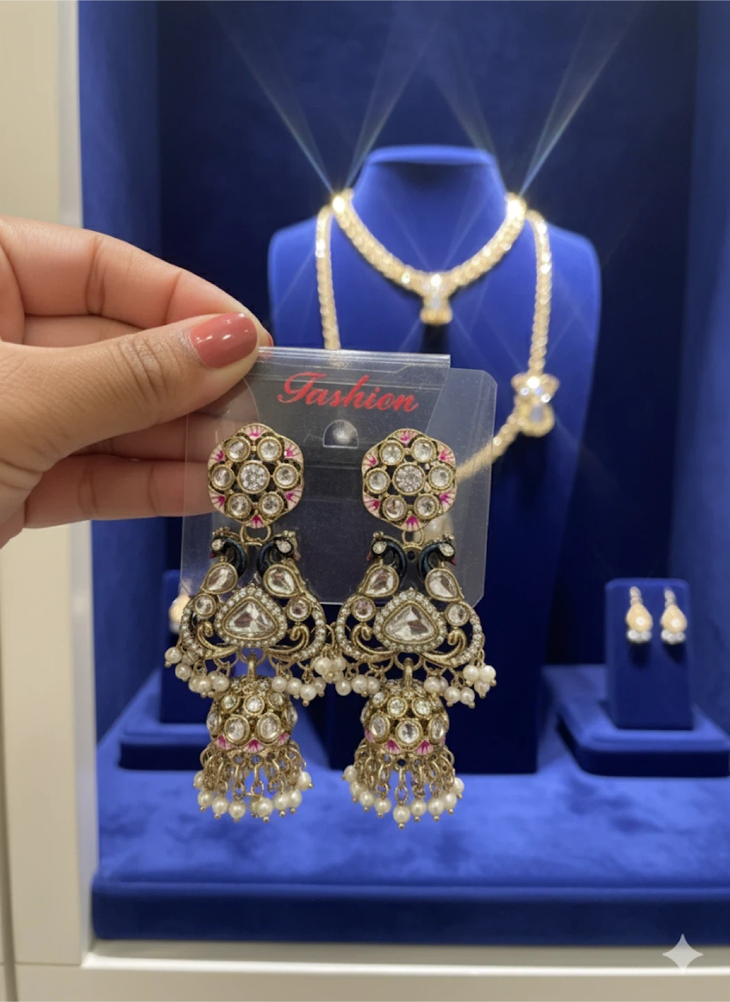Material: Alloy base with gold plating, kundan stones, pearls, enamel work.
