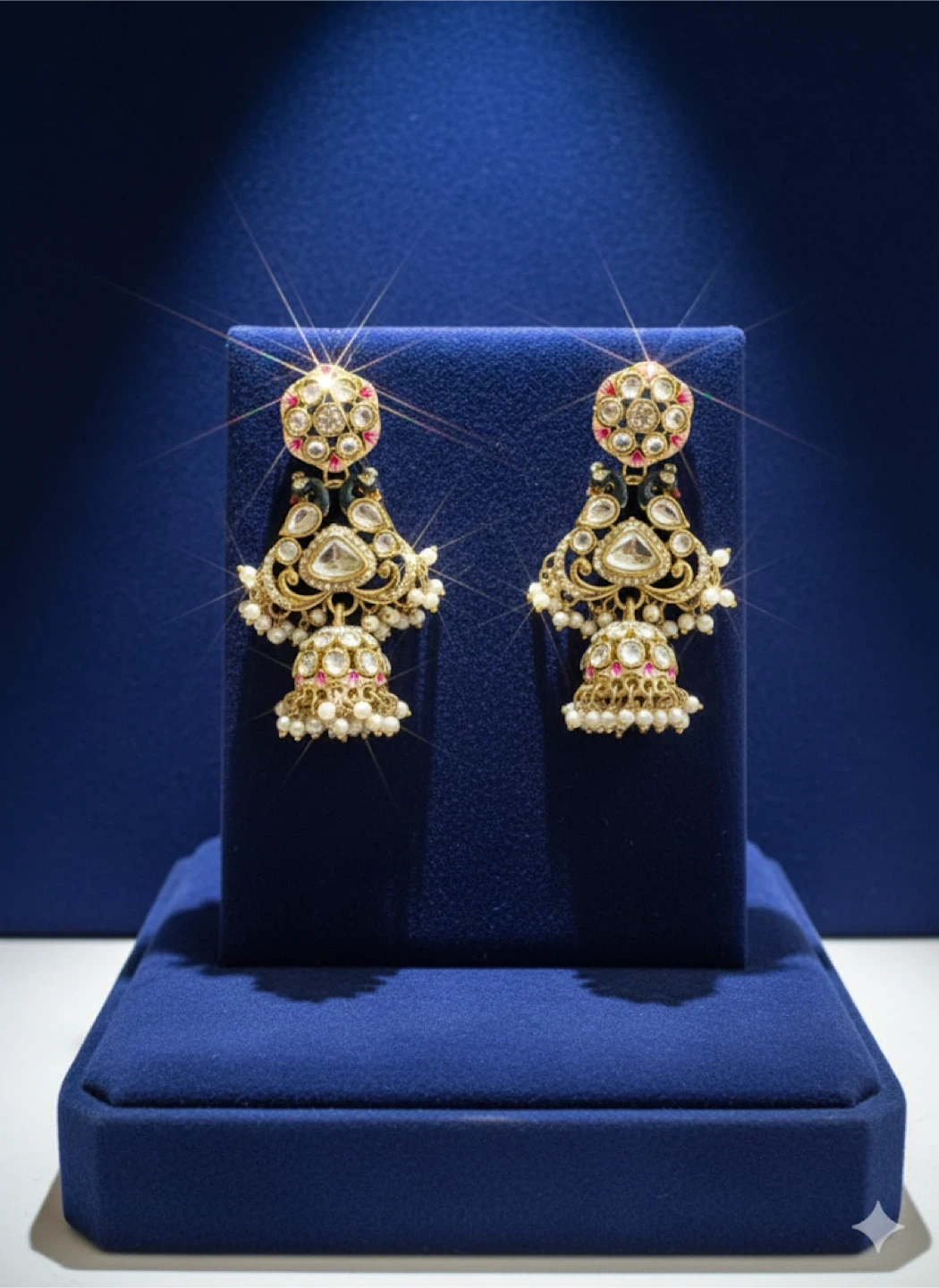 Jhumka base: Layered pearl drops with kundan embellishments for a royal finish.