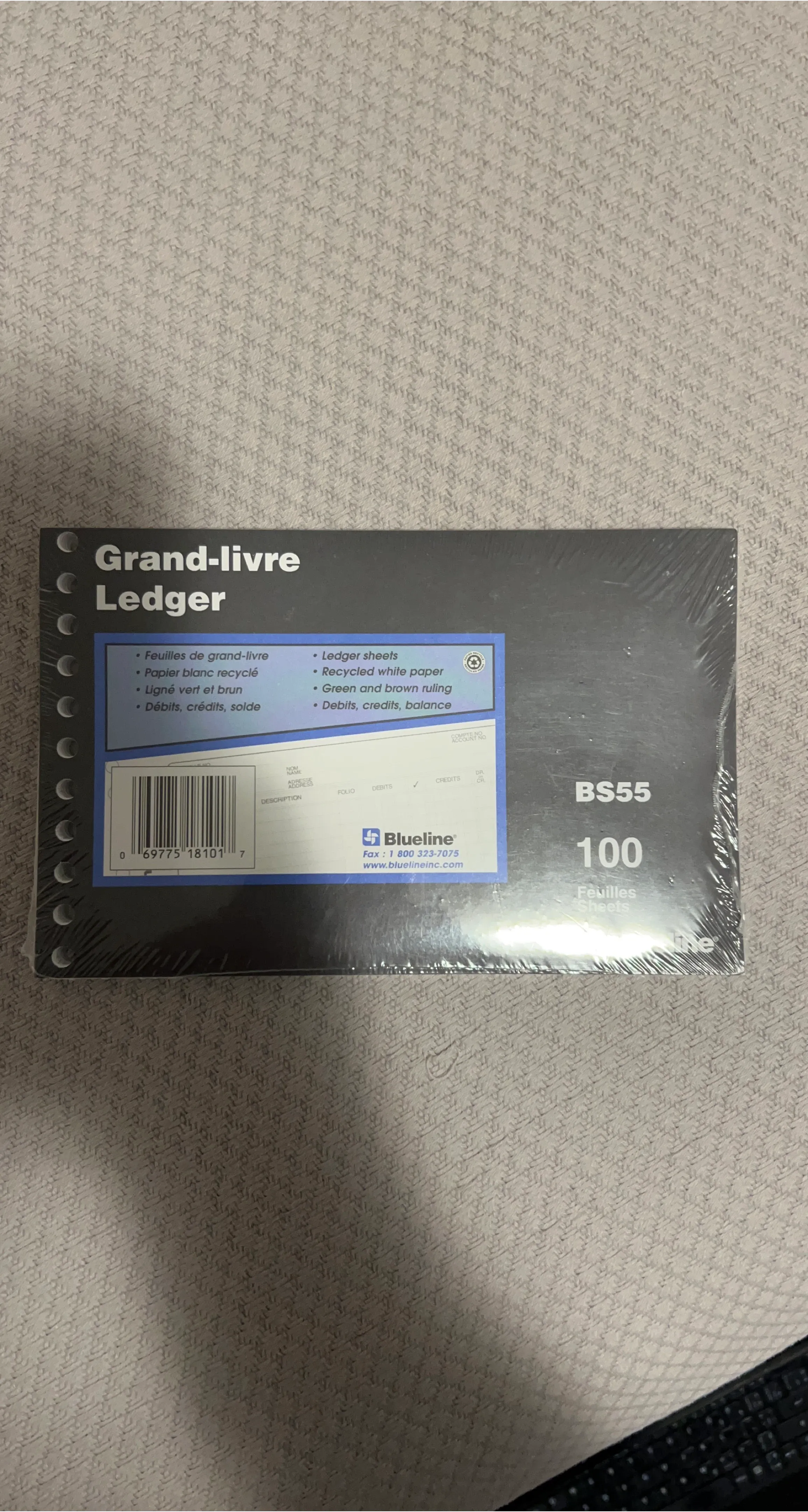 Blueline BS55 ledger sheets are made with recycled white paper. They feature green and brown ruling for debits, credits, and balance tracking. Each pack includes 100 sheets.