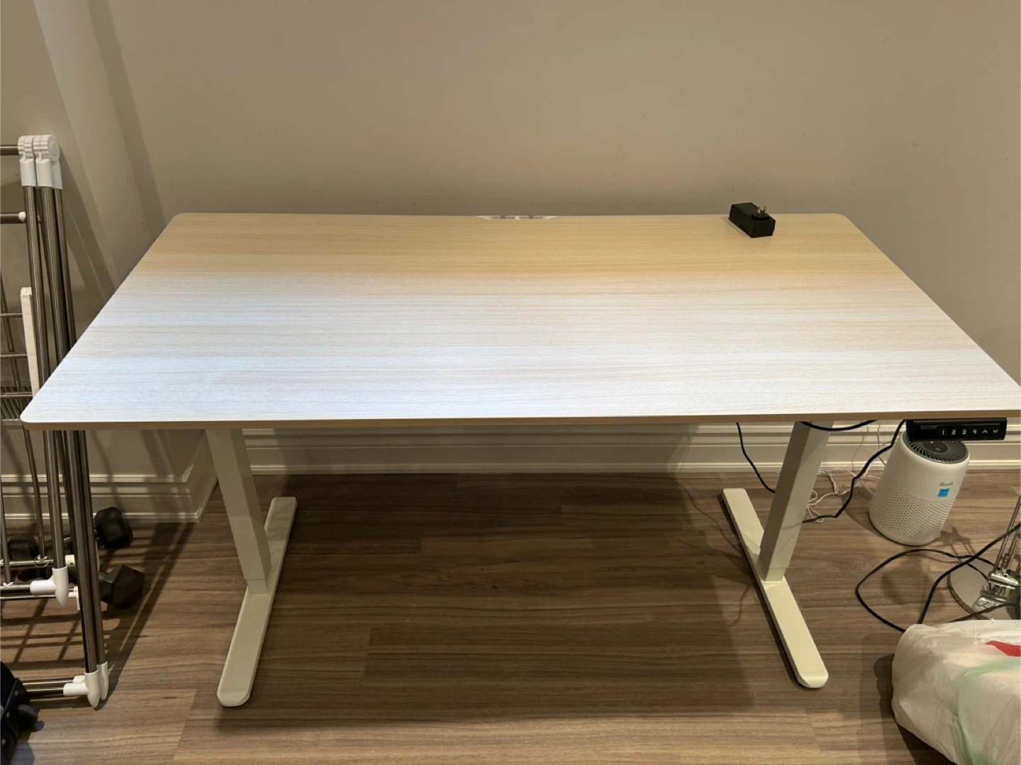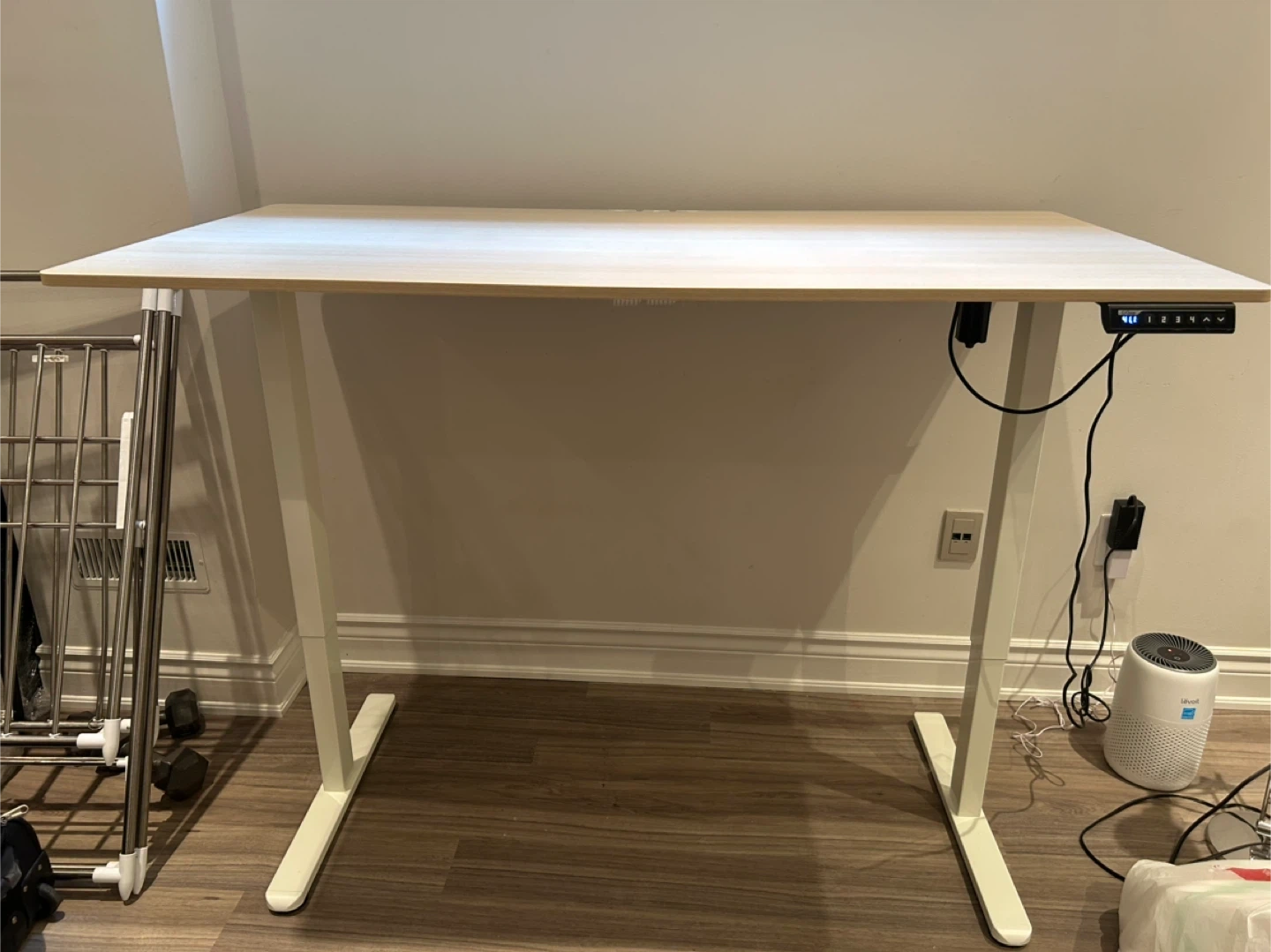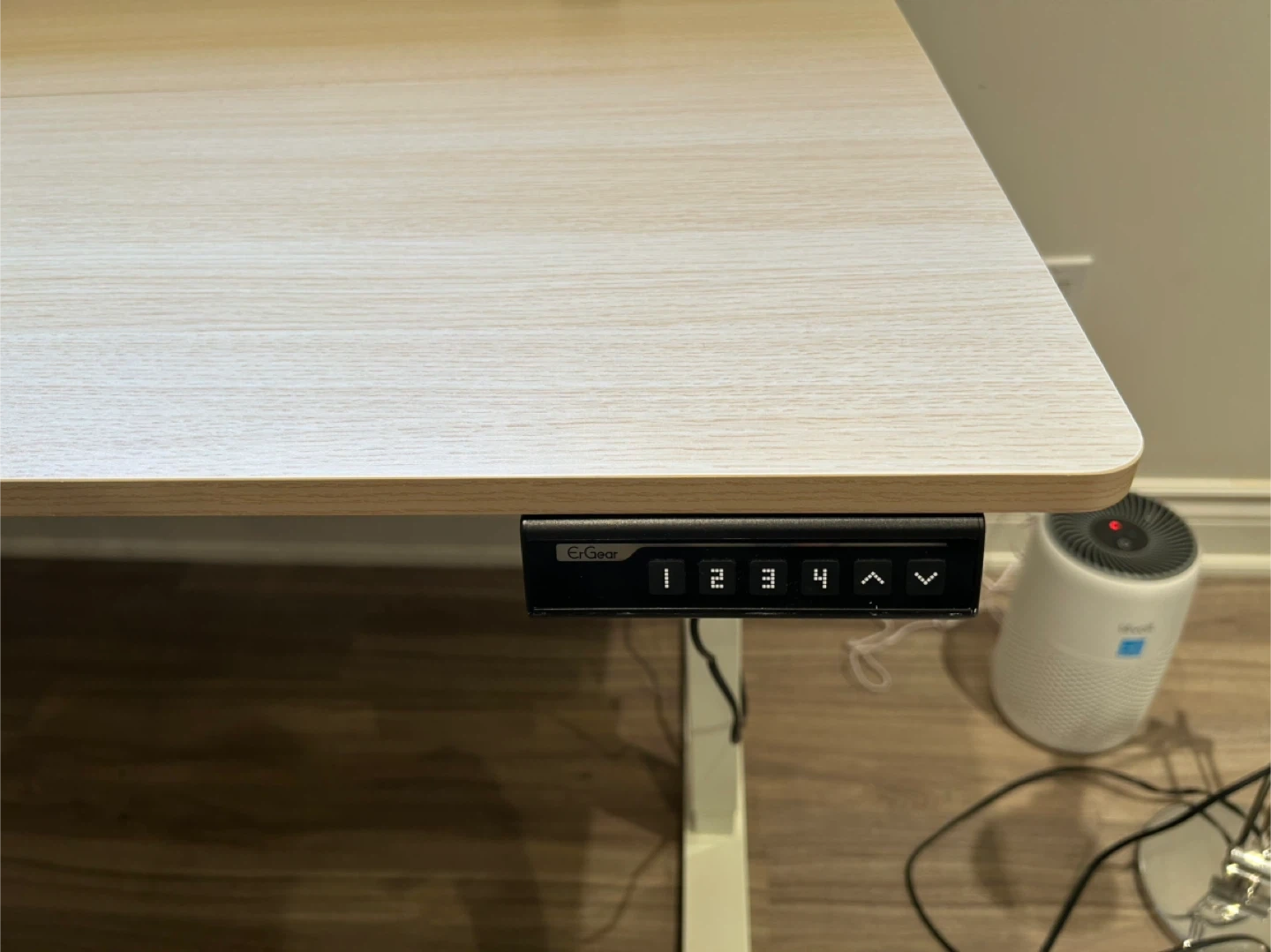 ErGear standing desk with a light wood grain laminate top and white metal legs. It features a digital control panel for height adjustment, with memory presets. There's also a hook on the side for hanging items. Perfect for creating a more dynamic workspace!