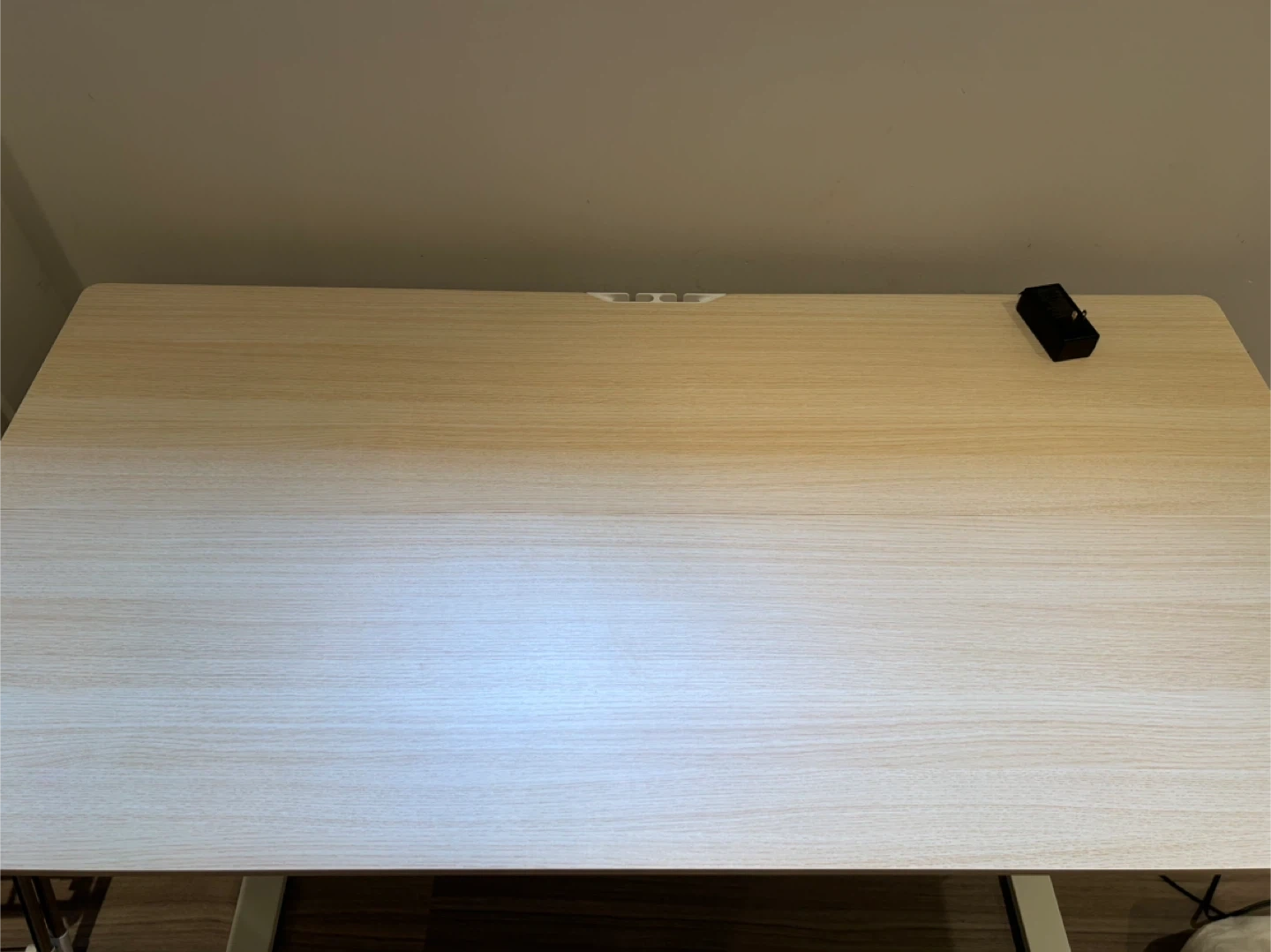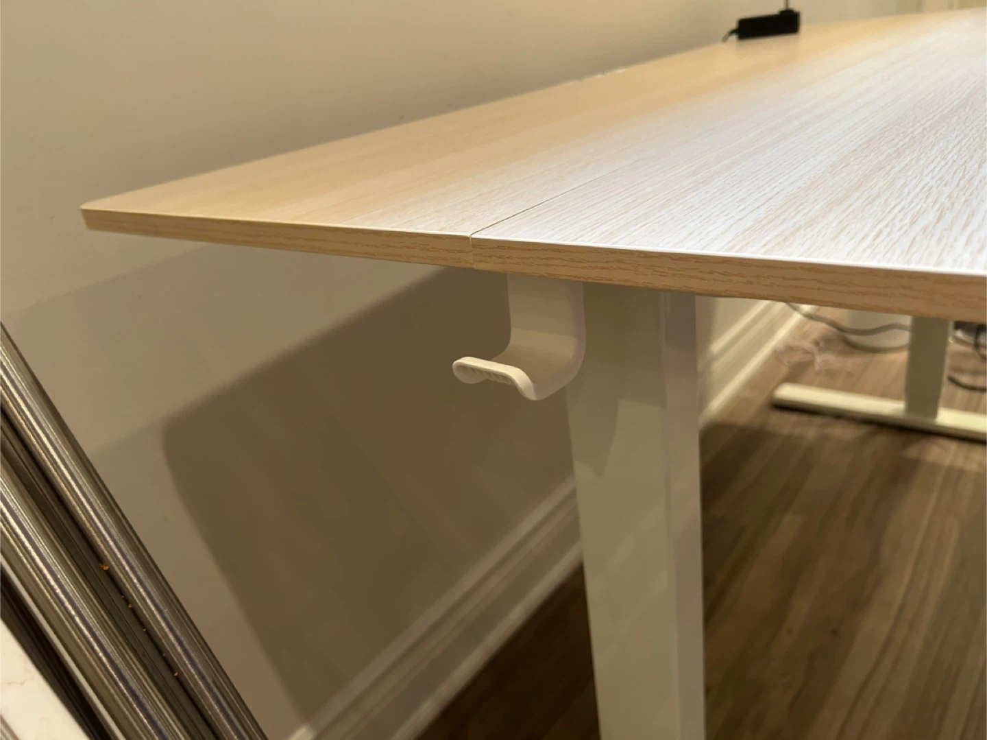 ErGear standing desk with a light wood grain laminate top and white metal legs. It features a digital control panel for height adjustment, with memory presets. There's also a hook on the side for hanging items. Perfect for creating a more dynamic workspace!