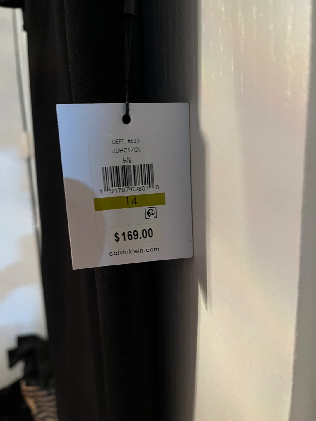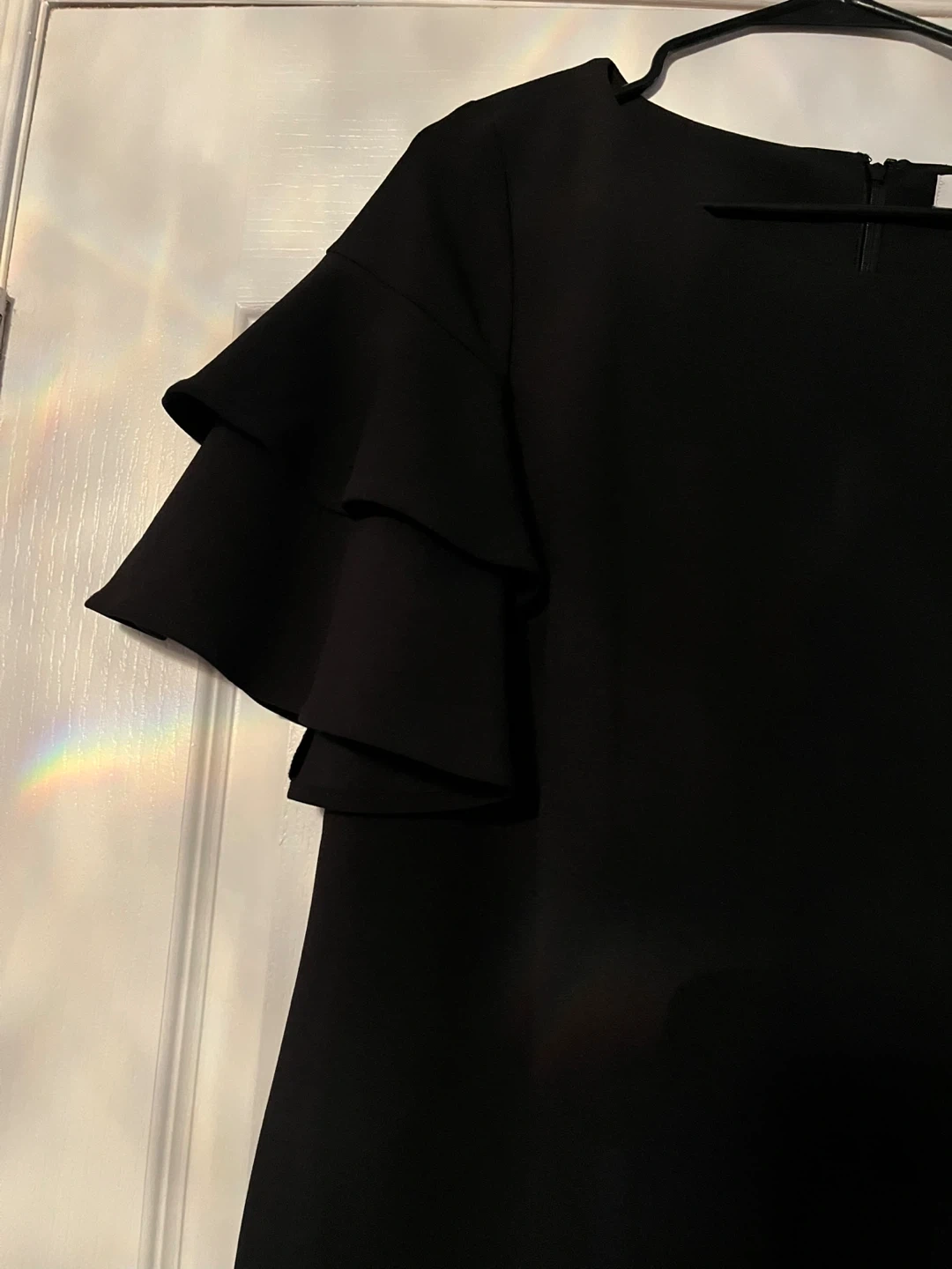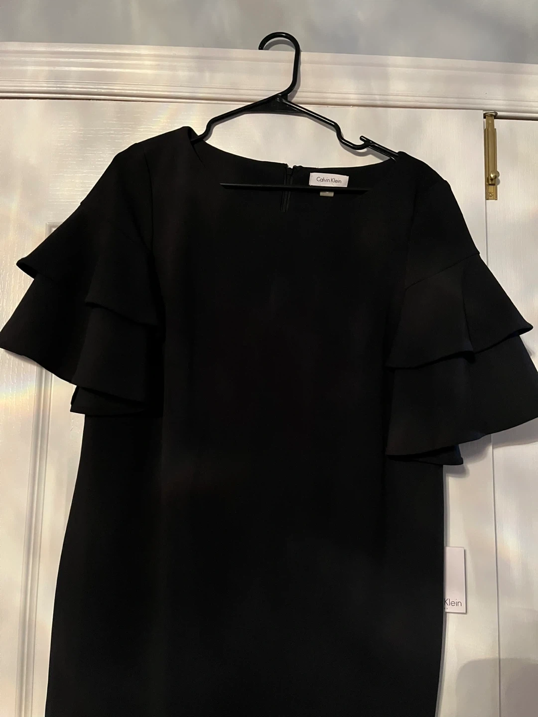 Selling a Calvin Klein dress in black, size 14. It features a stylish design with layered ruffle sleeves. The original tag is still attached, and it was originally bought for $169! Brand new never worn