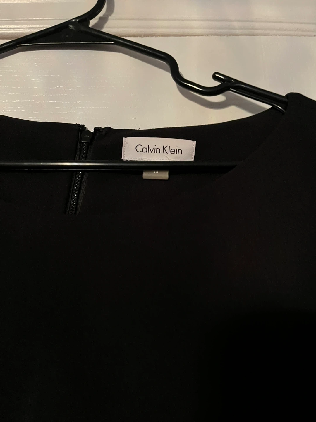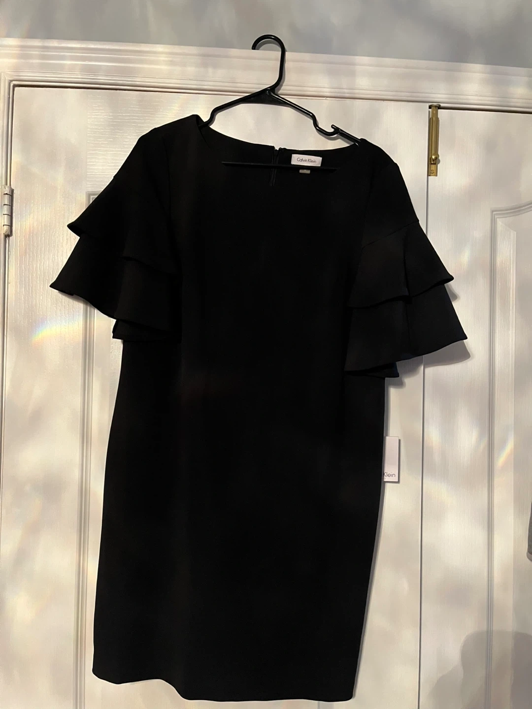 Selling a Calvin Klein dress in black, size 14. It features a stylish design with layered ruffle sleeves. The original tag is still attached, and it was originally bought for $169! Brand new never worn