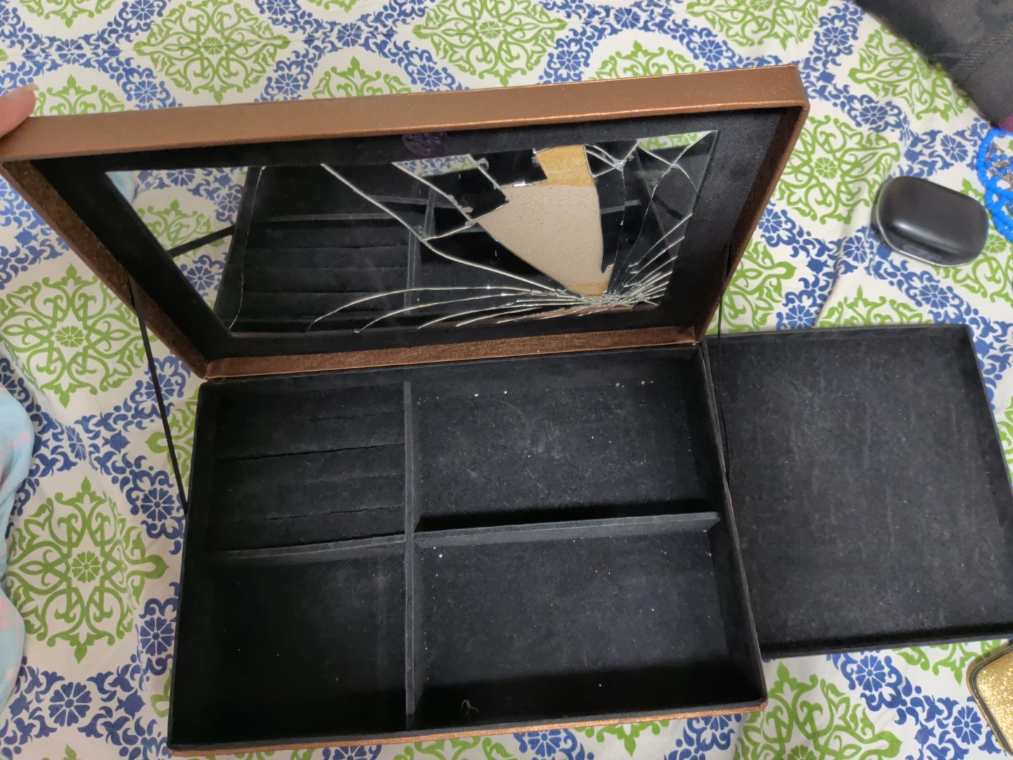 Selling a jewelry box that has a broken mirror. The box itself is in good condition, with a bronze-coloured frame and a decorative top. It has compartments for organizing your jewelry. Great for someone who doesn't mind replacing the mirror or repurposing the box!