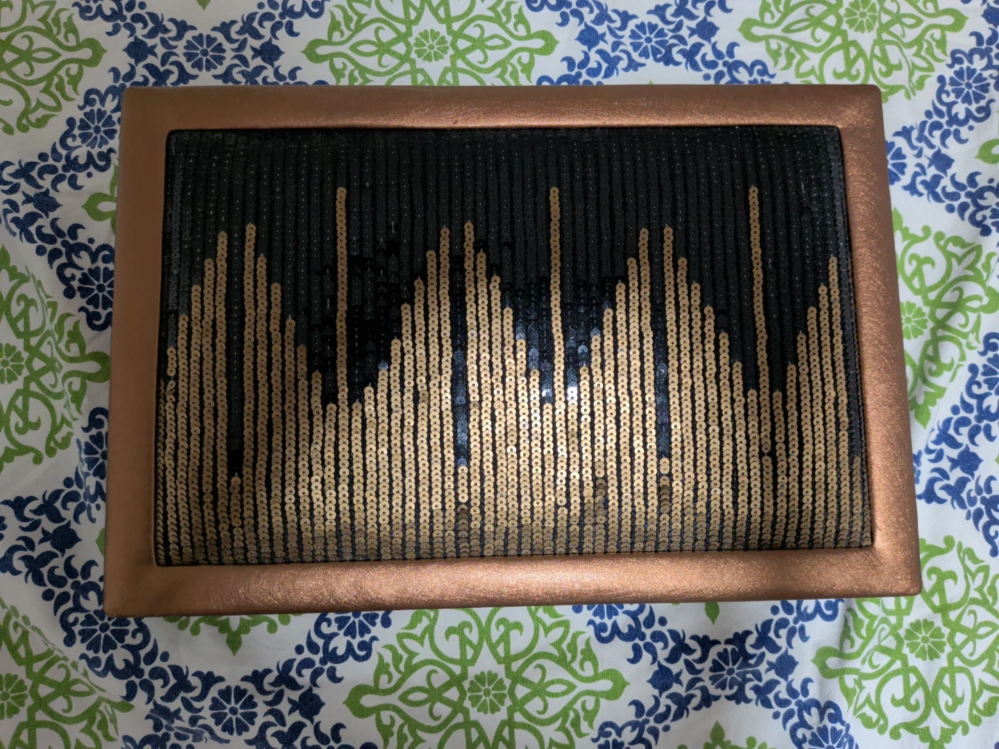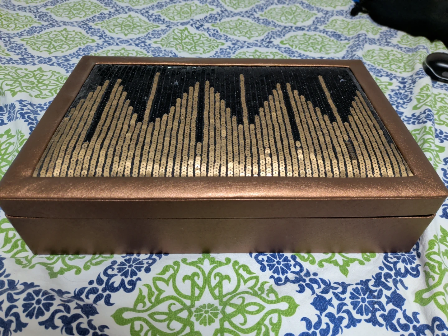 Selling a jewelry box that has a broken mirror. The box itself is in good condition, with a bronze-coloured frame and a decorative top. It has compartments for organizing your jewelry. Great for someone who doesn't mind replacing the mirror or repurposing the box!