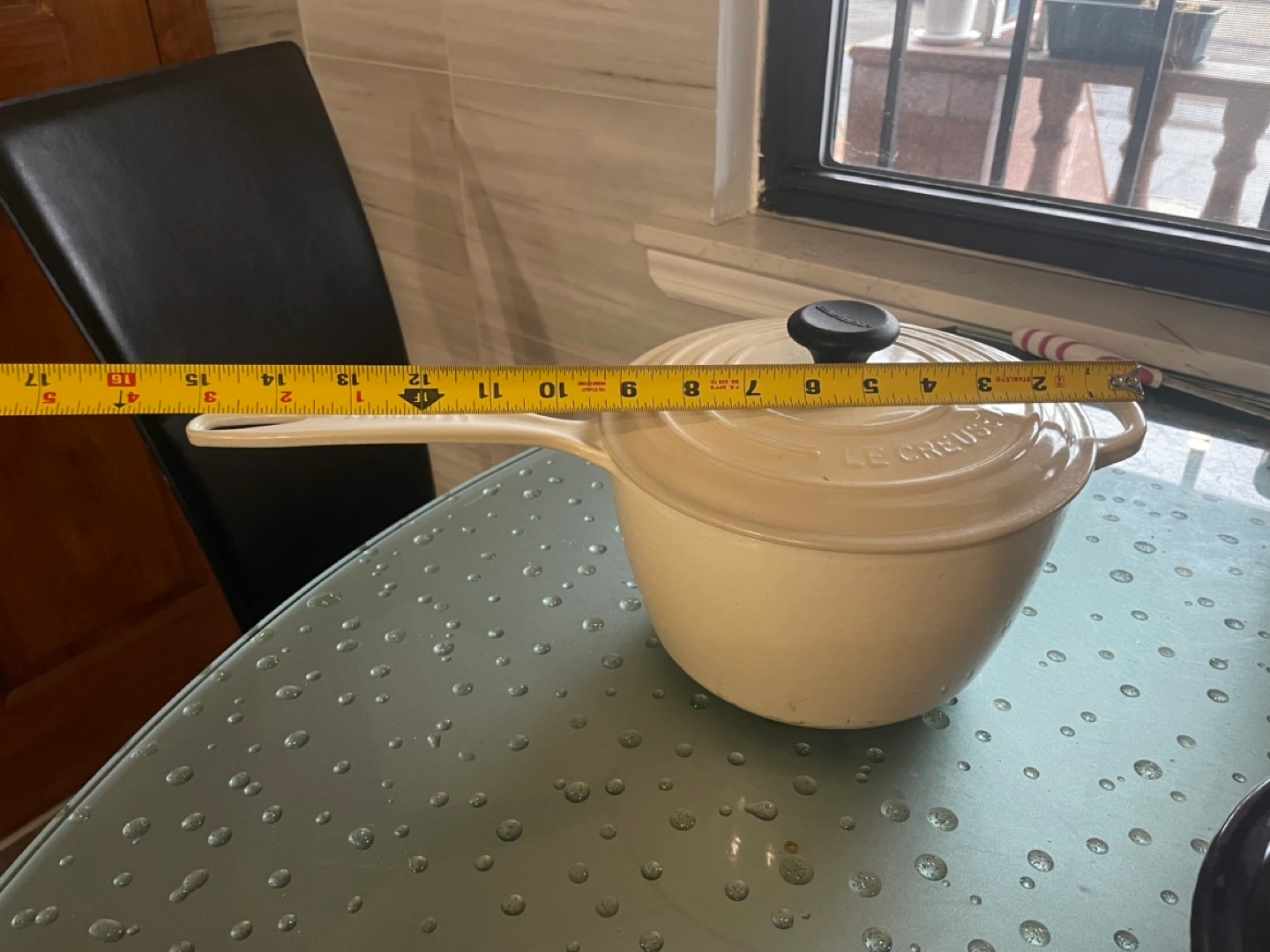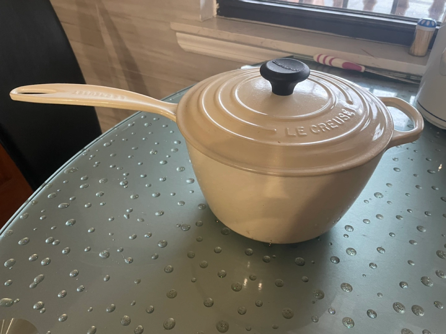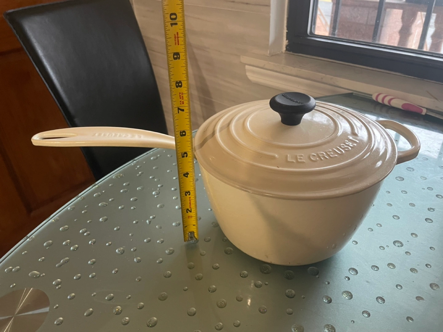 Used Le Creuset round French oven. White enamel exterior. Excellent for soups, stews, and other dishes. Includes lid.