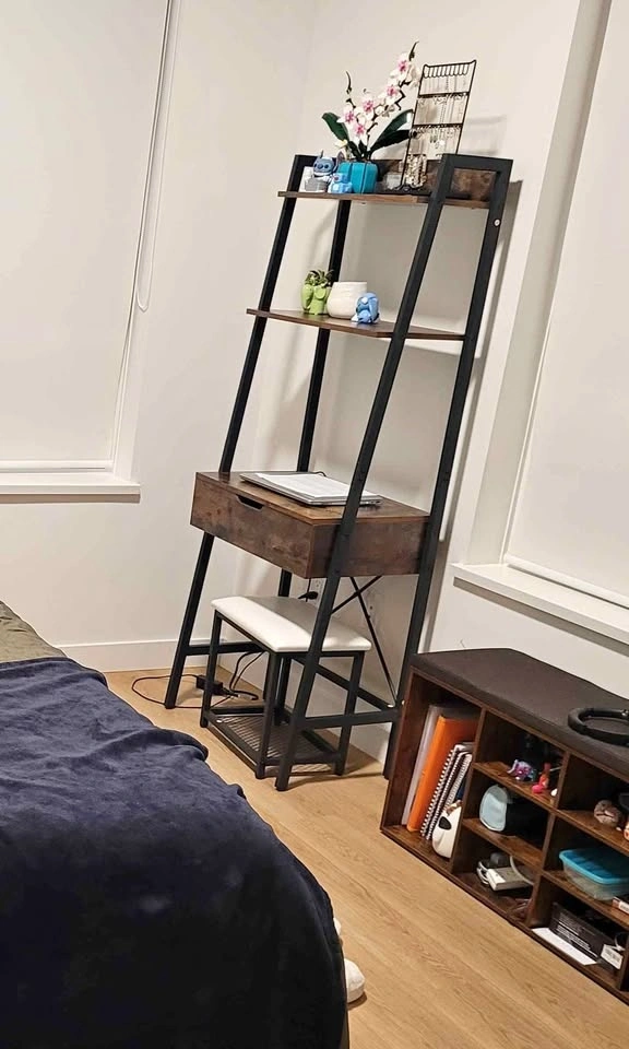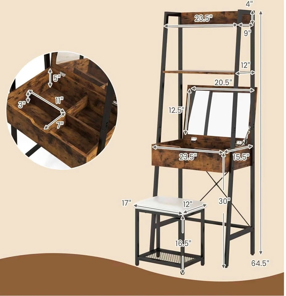 Rustic brown CHARMAID vanity desk set, 23.5" x 15.5" x 64.5". Space-saving ladder-style makeup vanity perfect for small bedrooms. Features a flip-top mirror that closes to create a flat desk surface, spacious tabletop, 2 shelves, and 4 compartments for makeup and accessories. Includes a padded stool with an extra storage shelf. Sturdy metal frame and MDF construction with an anti-tip safety device. Great as a makeup vanity or small writing desk. Can be disassembled if asked.