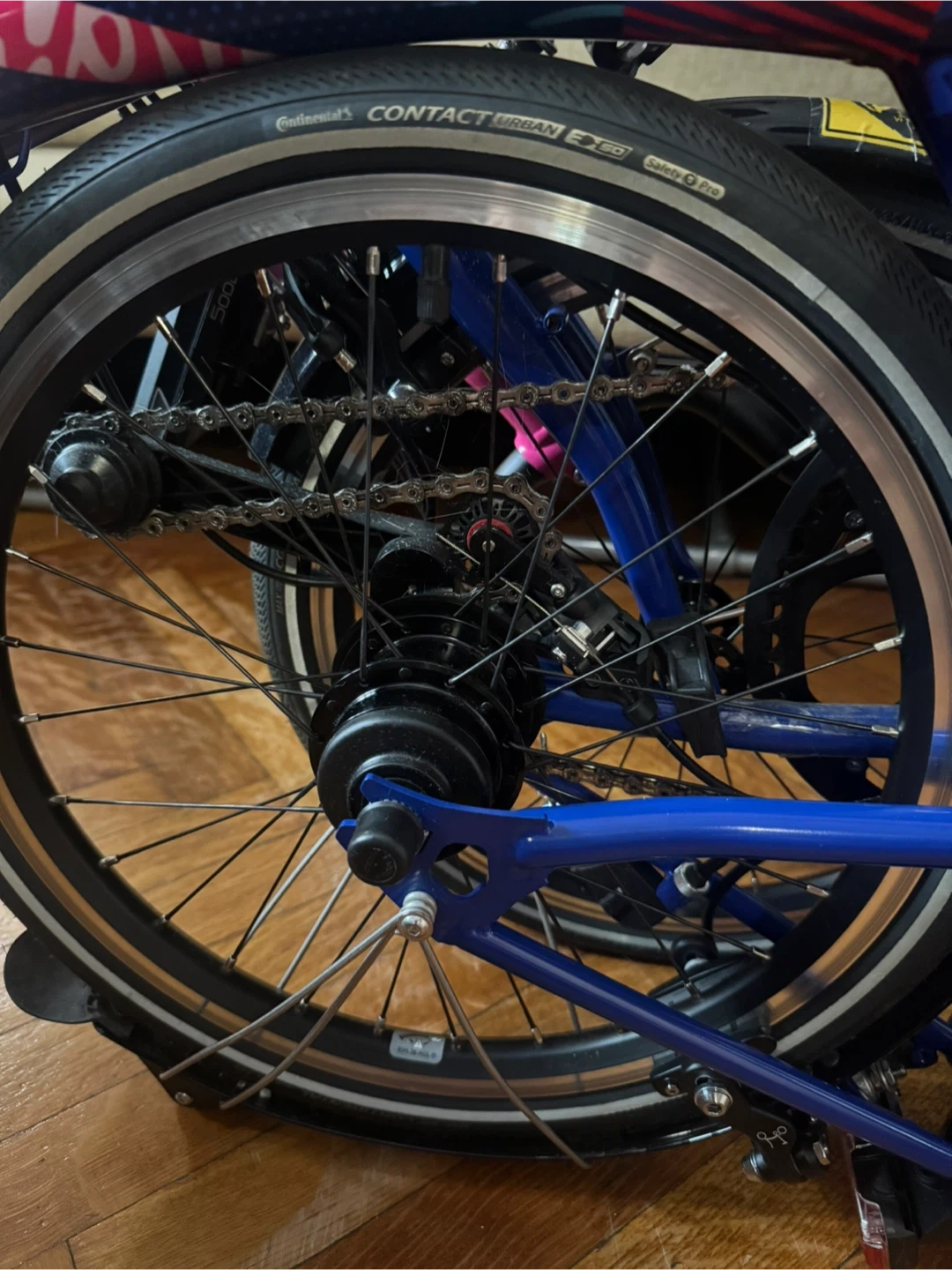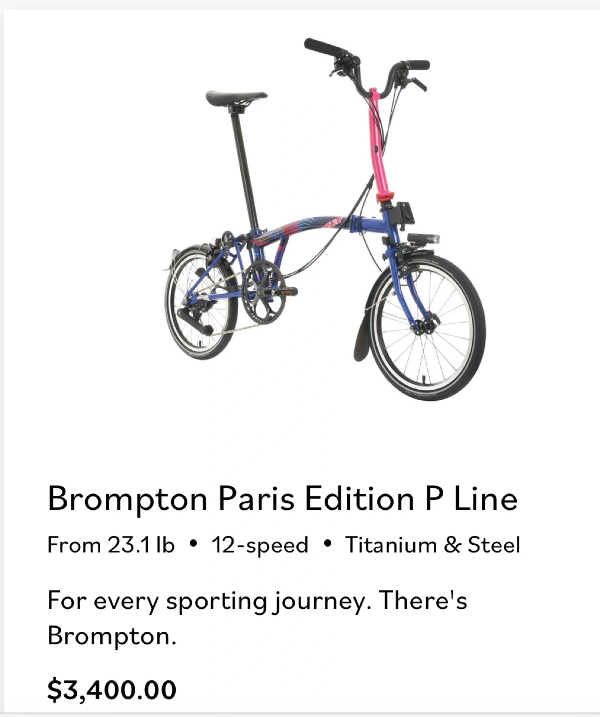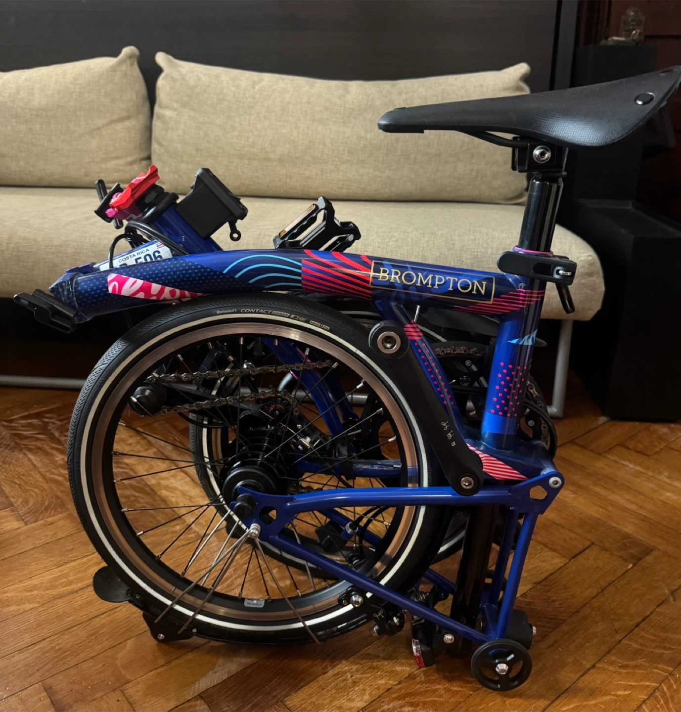 This is a Limited Special Olympic Edition Brompton Paris folding bicycle.