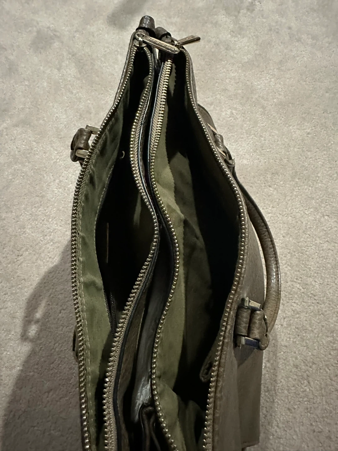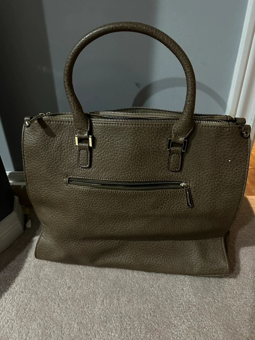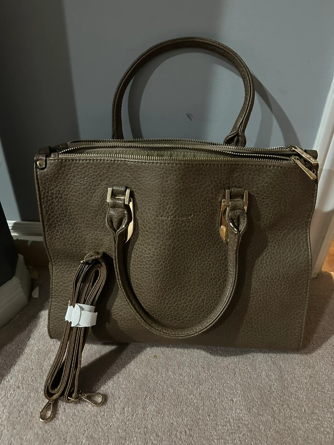 This is a taupe David Jones tote bag made from faux leather. It has a zip top closure with multiple compartments inside. Comes with a detachable shoulder strap. Great for everyday use!
