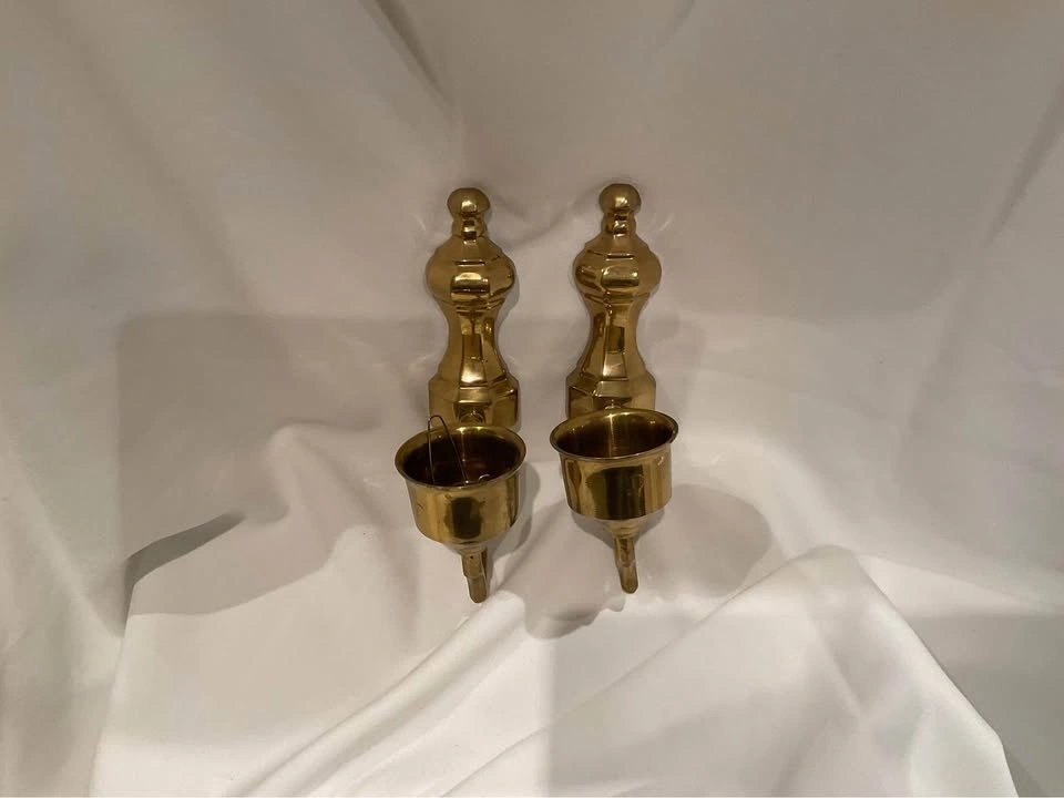 Pair of brass plated wall scones. Has the piece to insert a lamp over the wall scone. Has some natural patina. Good condition. Wall plaque is 6 1/2". Extension from wall to arm is 5 1/2". From a smoke & pet free home.