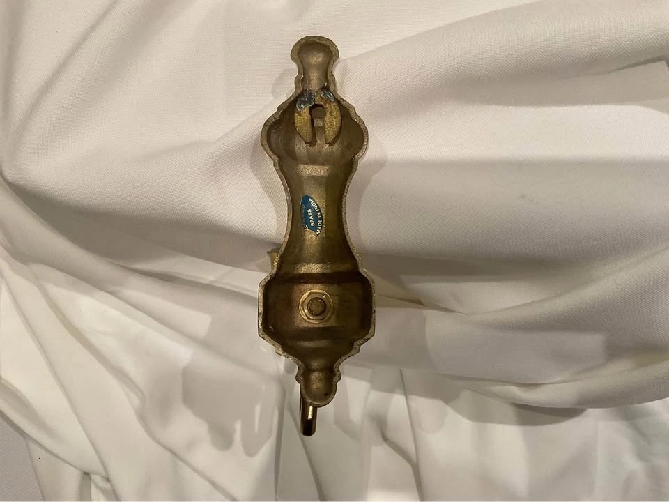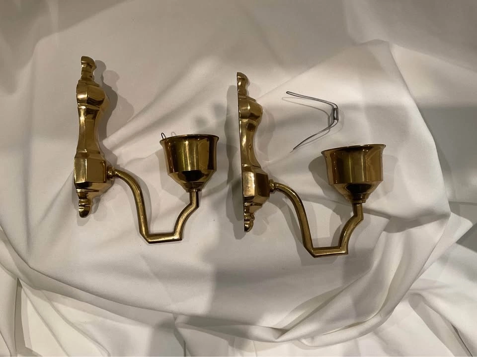Pair of brass plated wall scones. Has the piece to insert a lamp over the wall scone. Has some natural patina. Good condition. Wall plaque is 6 1/2". Extension from wall to arm is 5 1/2". From a smoke & pet free home.