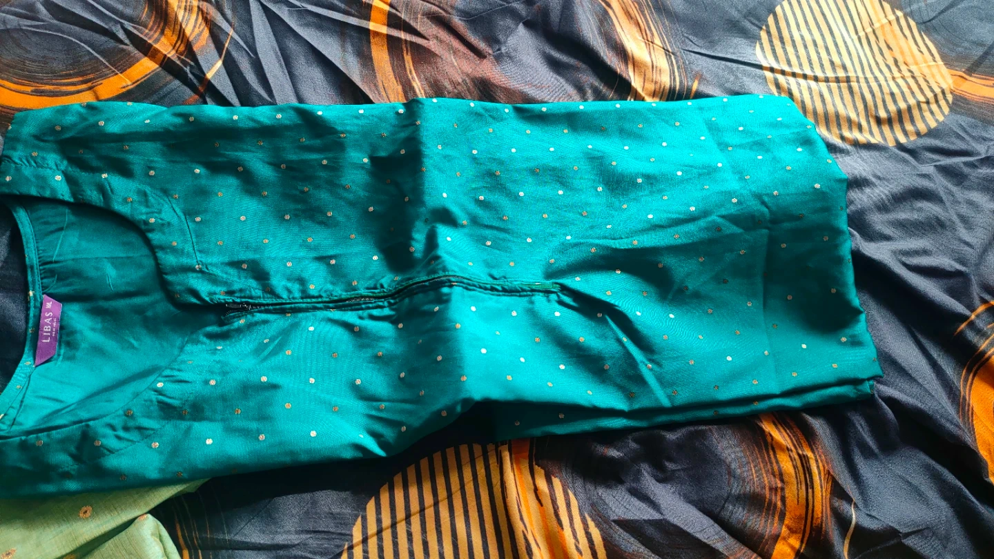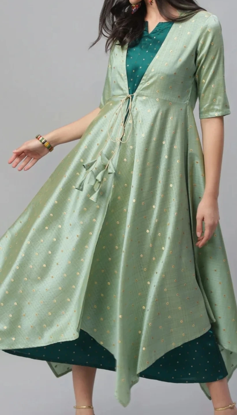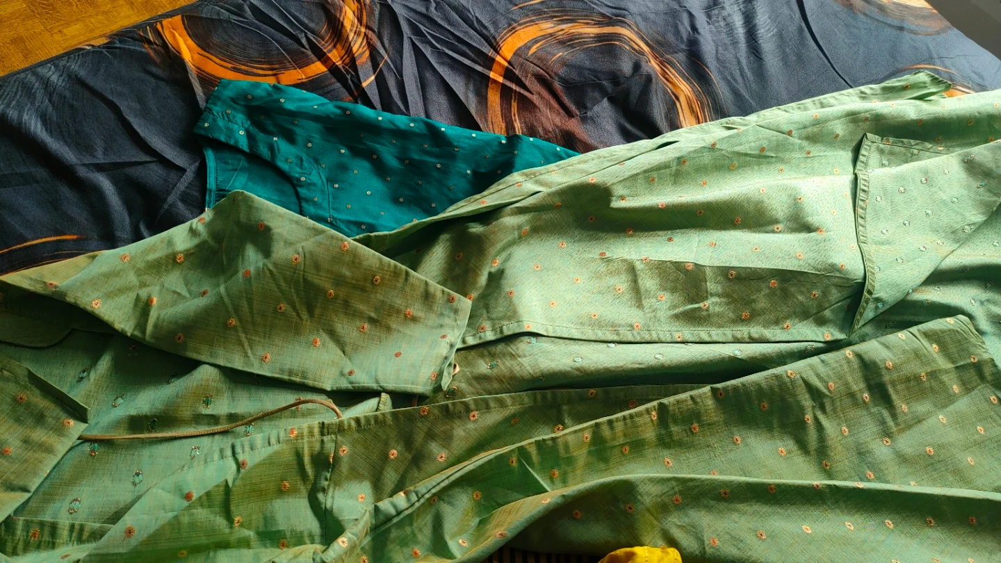 This kurti set comes in a teal and green colour combination with sequin detailing. It's a stylish two-piece outfit. The material looks like silk or a blend.