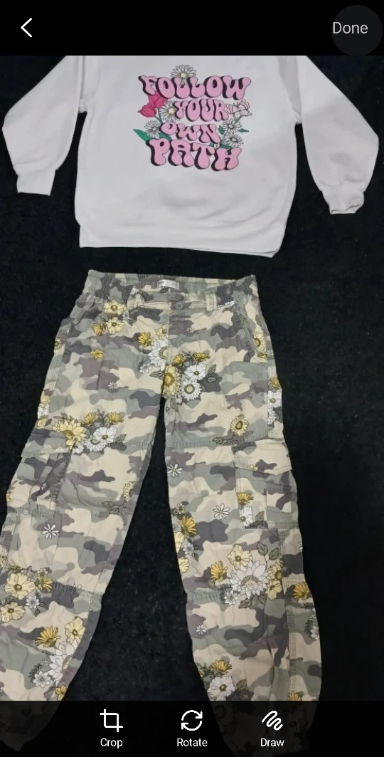 🌸Cute set with a white sweater that says 'Follow Your Own Path' and camo floral pants. Perfect for a casual day out!