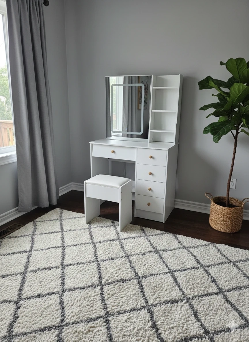White Vanity Table with Lighted Mirror & Stool