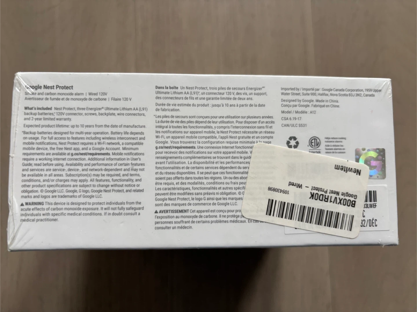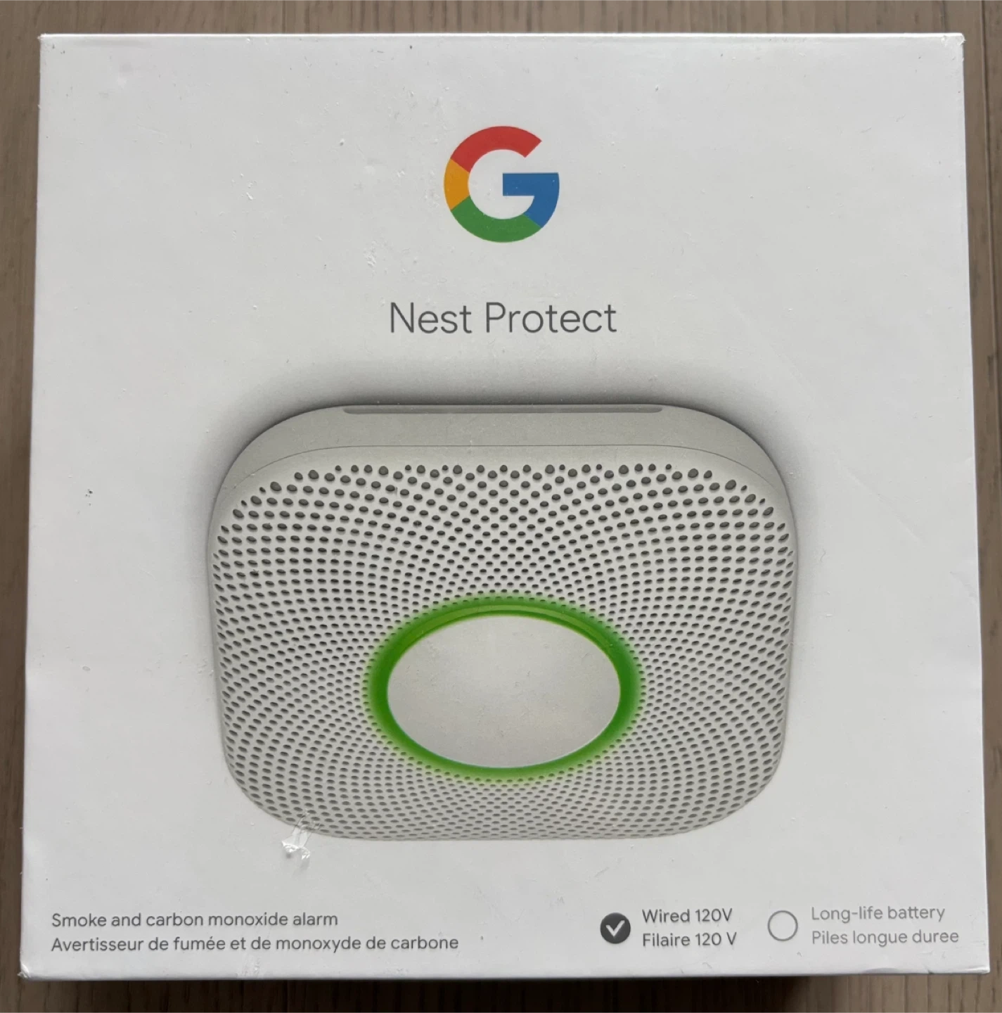 This is a brand new Google Nest Protect, 2nd Gen, smoke and carbon monoxide alarm. It's a wired 120V model with a long-life battery backup. This alarm detects fast and slow burning fires and CO, speaks in a friendly voice, and can silence false alarms from your phone.