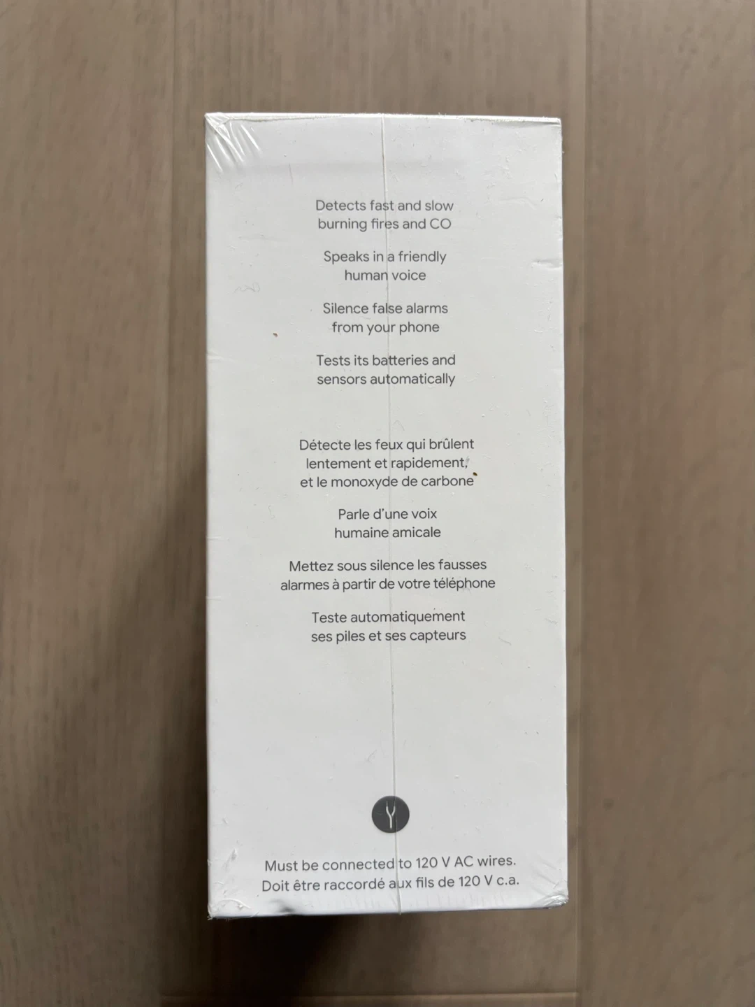 This is a brand new Google Nest Protect, 2nd Gen, smoke and carbon monoxide alarm. It's a wired 120V model with a long-life battery backup. This alarm detects fast and slow burning fires and CO, speaks in a friendly voice, and can silence false alarms from your phone.