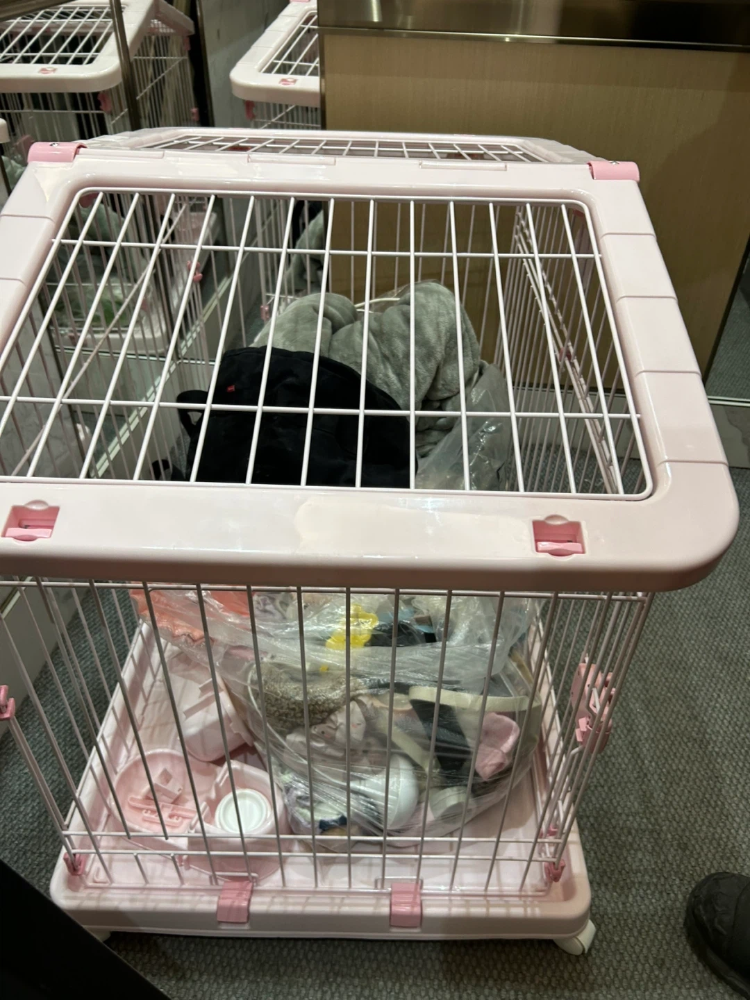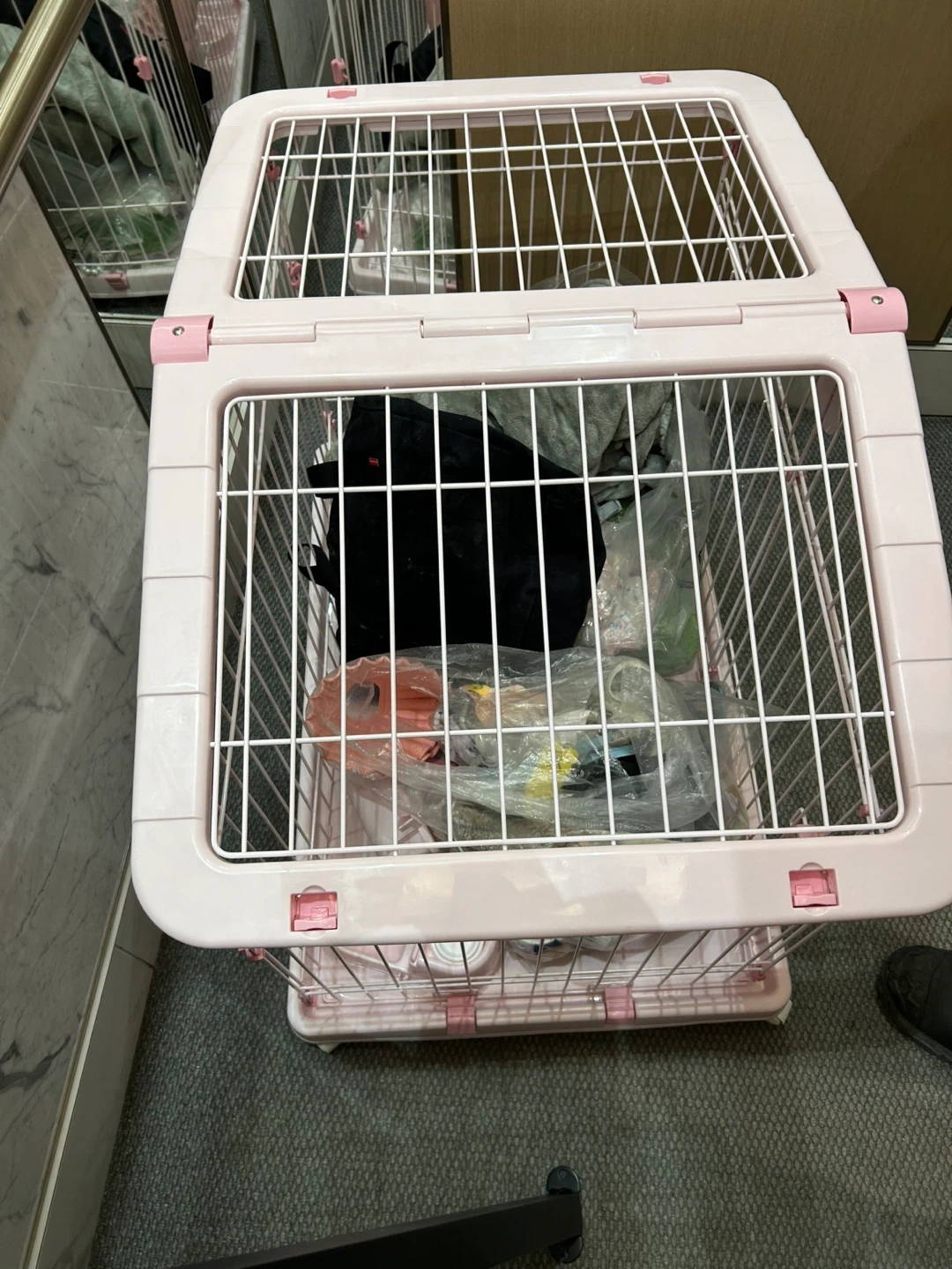 This is a pink pet playpen or crate, suitable for small animals. It's made of durable metal wire with a plastic base and pink trim. The enclosure has a secure latching mechanism and a convenient top-opening door. It's perfect for providing a safe and contained space for your pet.