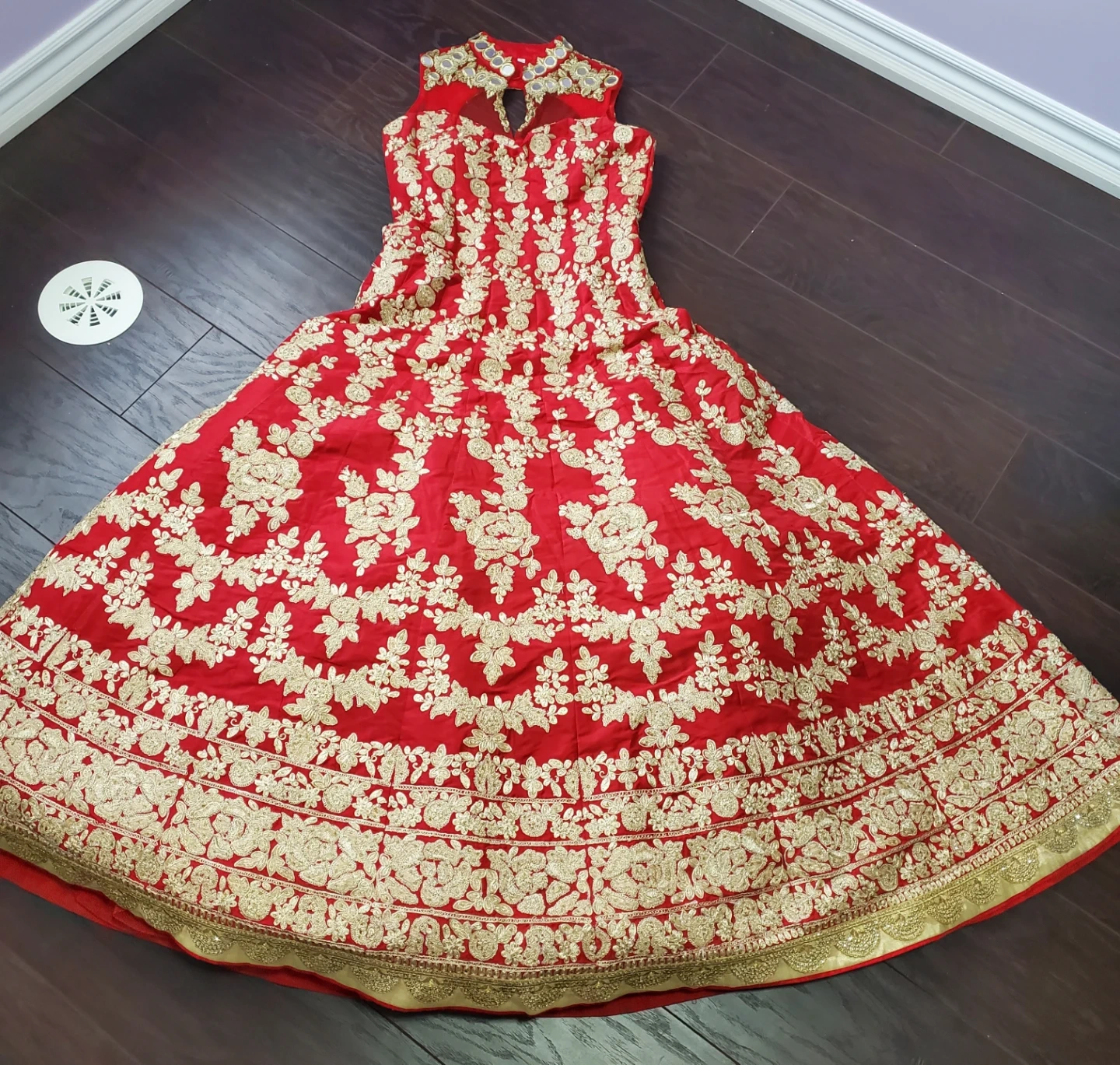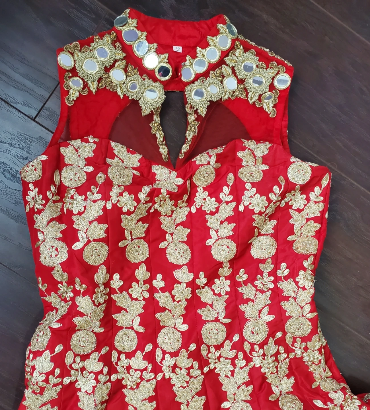 Beautiful red dress with gold embroidery! It's in great condition and would be perfect for a special occasion.