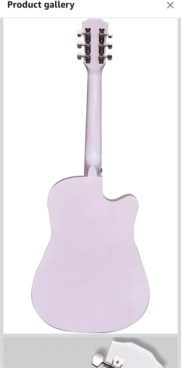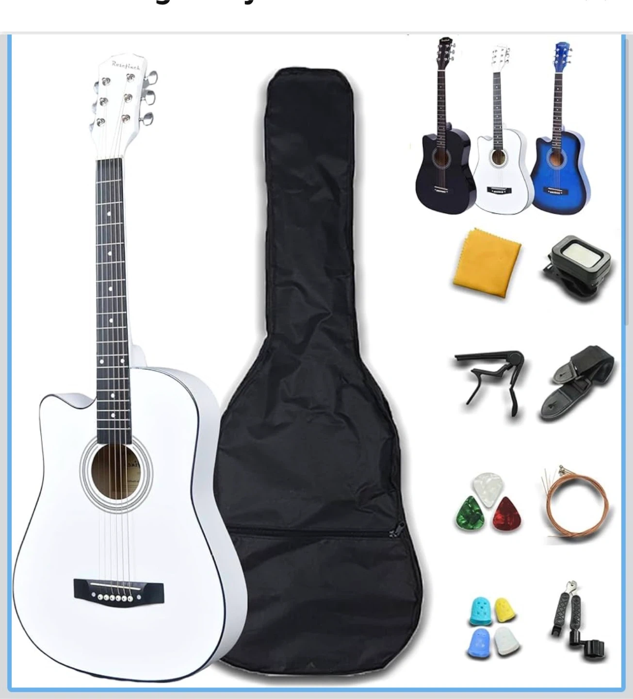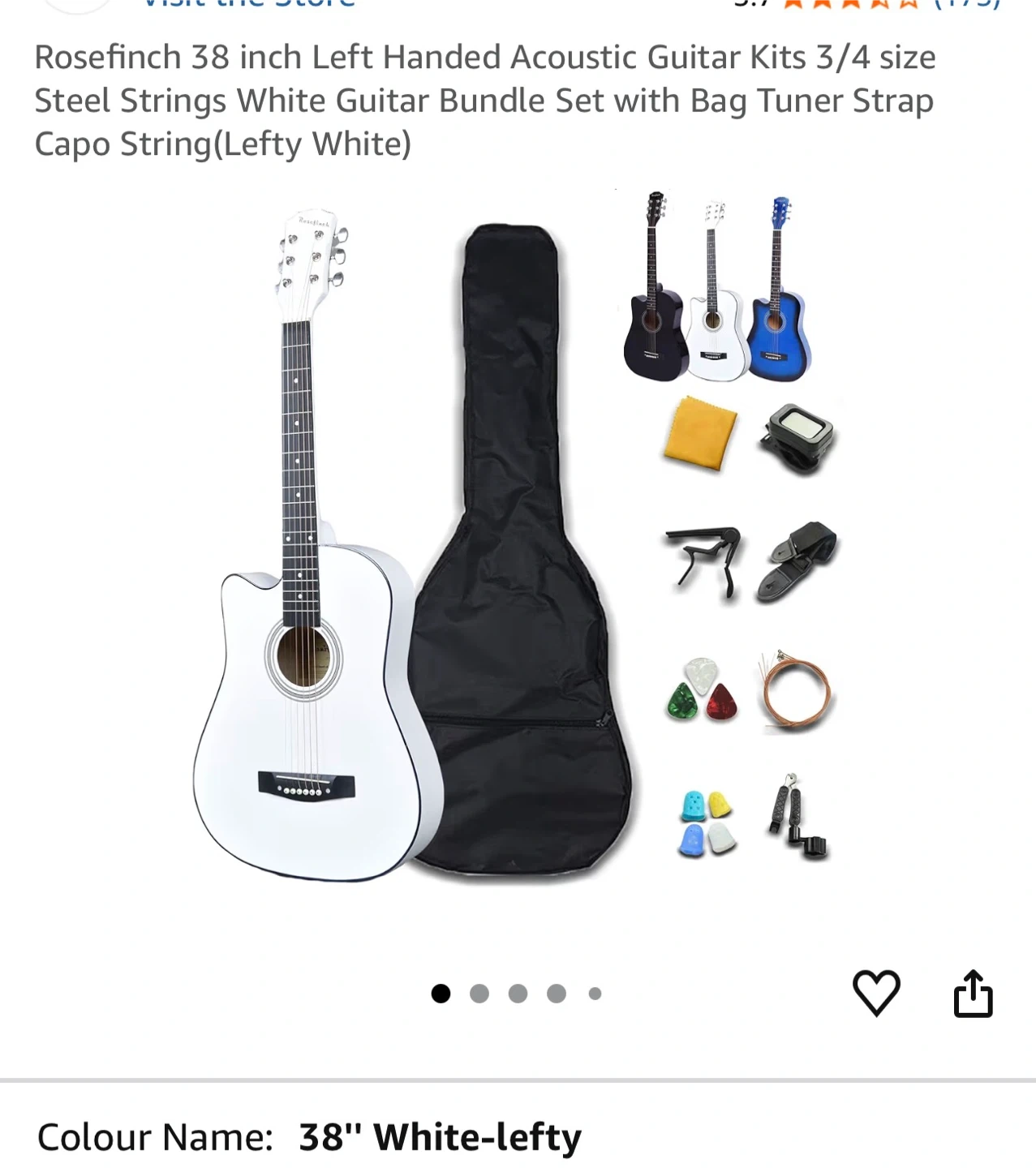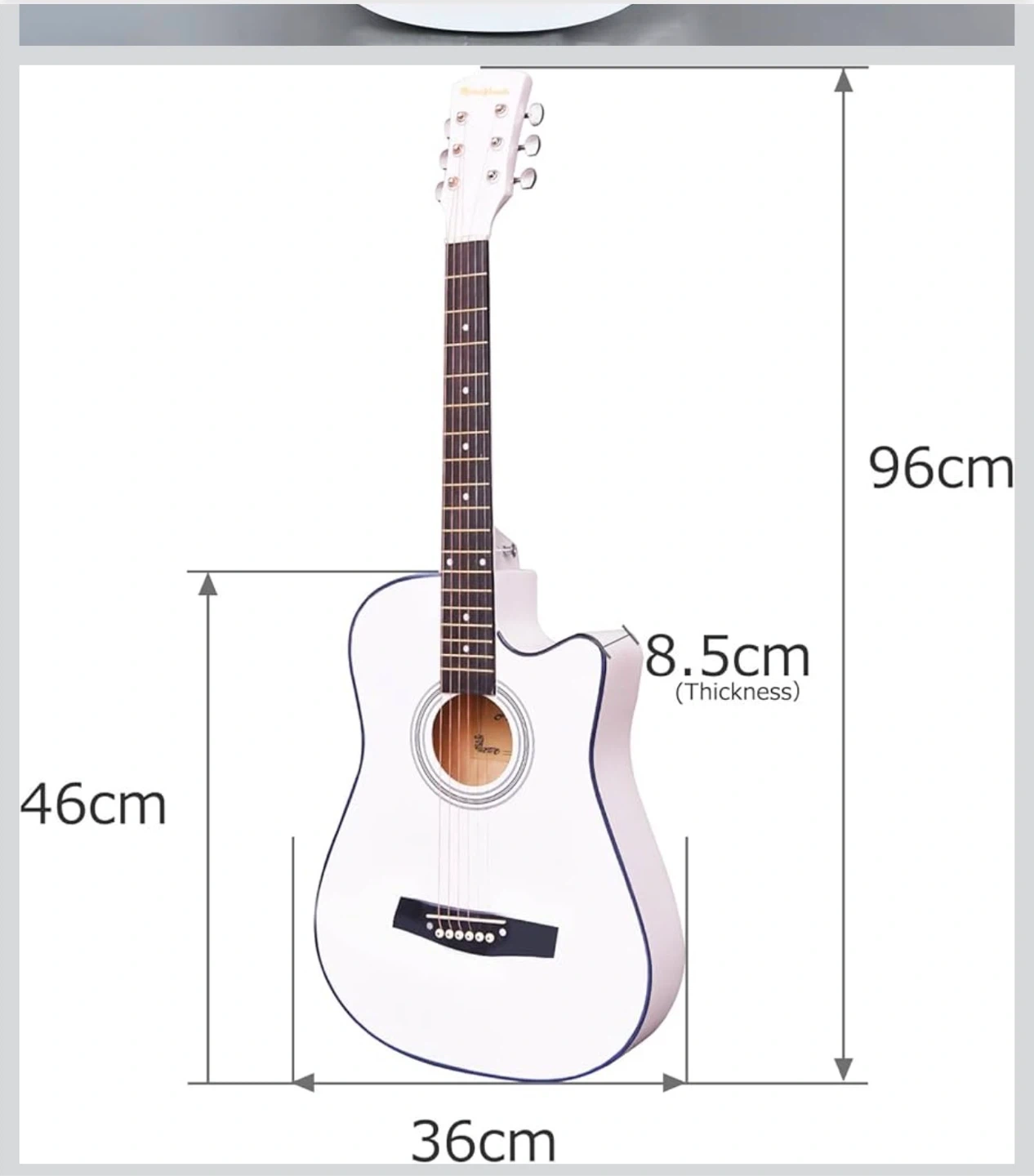 This is a Rosefinch 38-inch left-handed acoustic guitar bundle. It's a 3/4 size guitar with steel strings. The kit includes a gig bag, tuner, strap, capo, picks, and spare strings. Guitar dimensions are 96cm height, 36cm width, and 8.5cm thickness.(brand new)