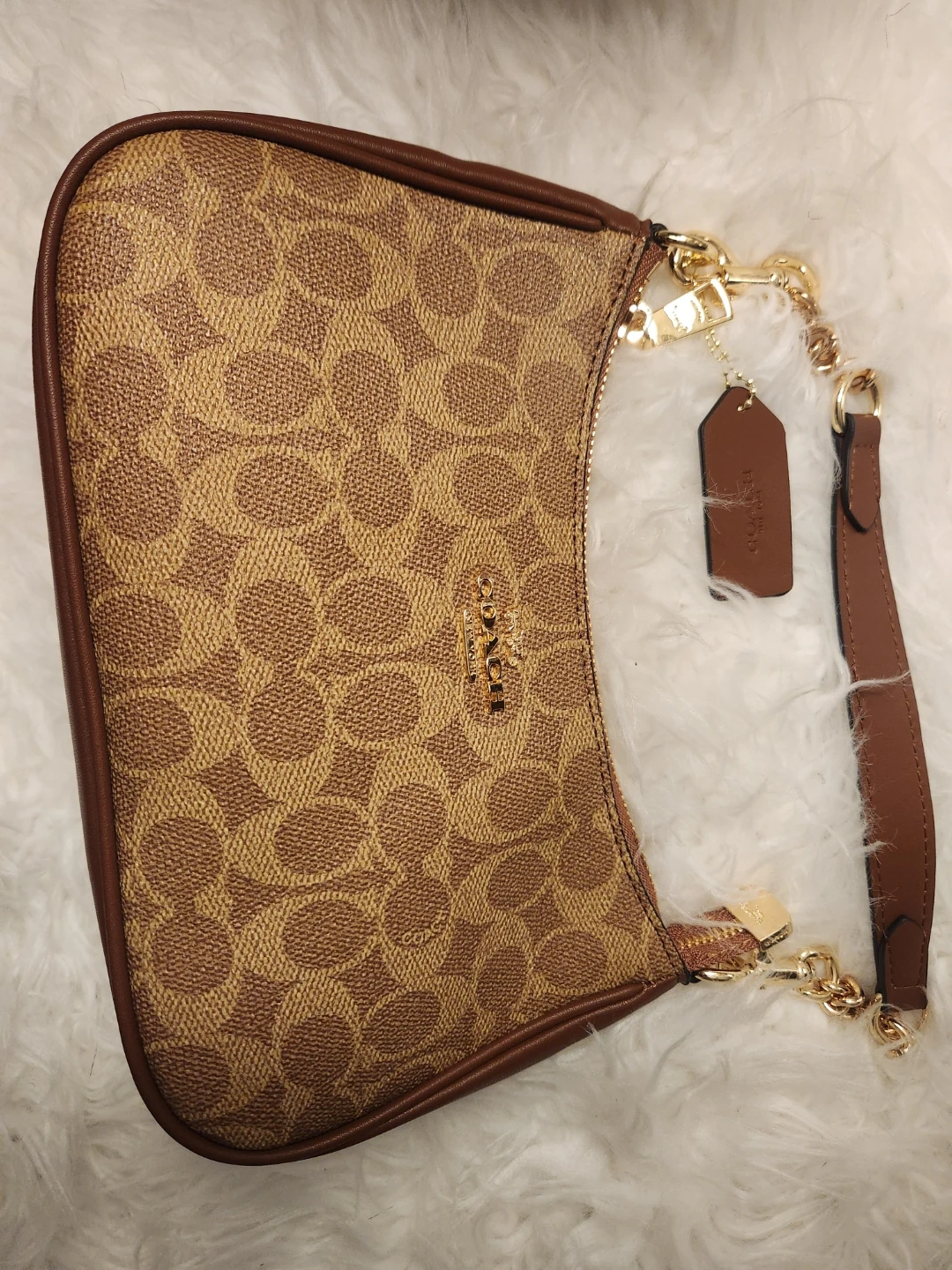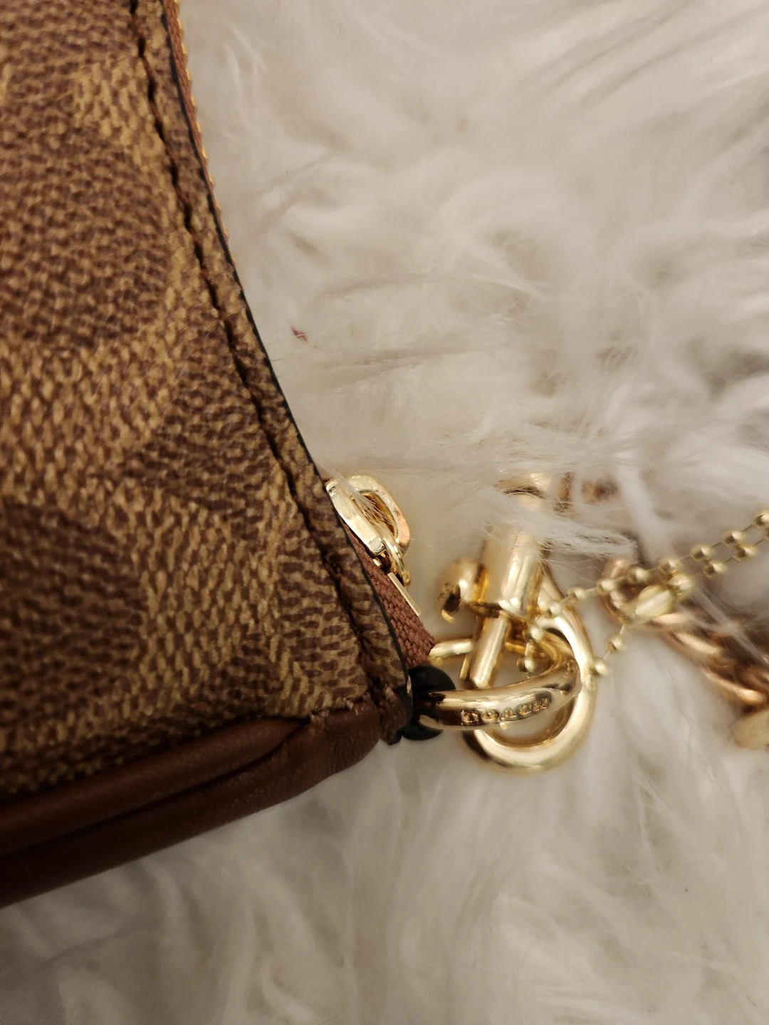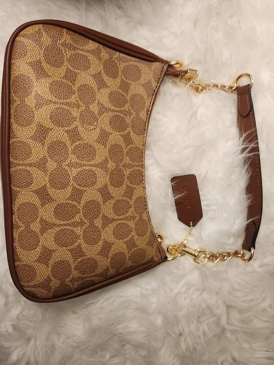 This Coach shoulder bag comes in their signature canvas with brown leather trim. It features a zip-top closure and an interior slip pocket. The bag has gold-tone hardware and a chain strap.