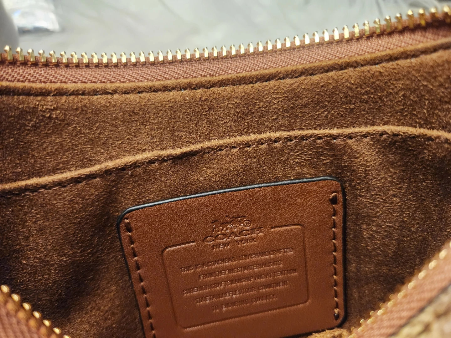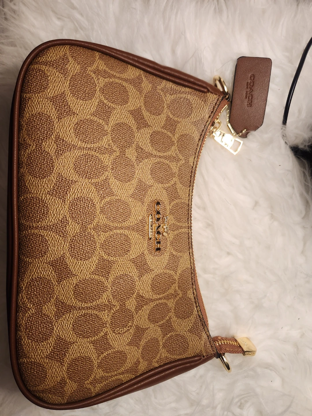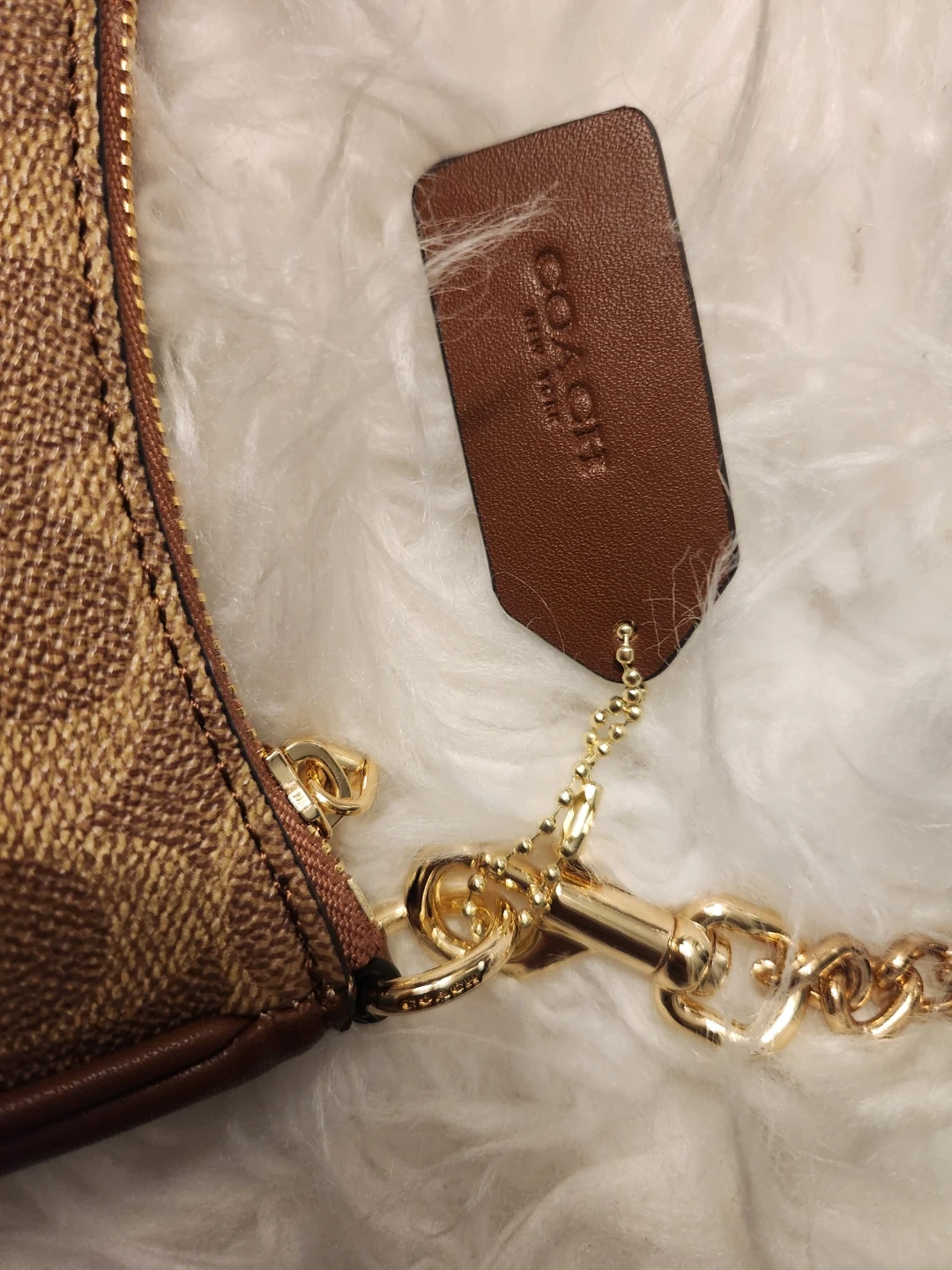 This Coach shoulder bag comes in their signature canvas with brown leather trim. It features a zip-top closure and an interior slip pocket. The bag has gold-tone hardware and a chain strap.
