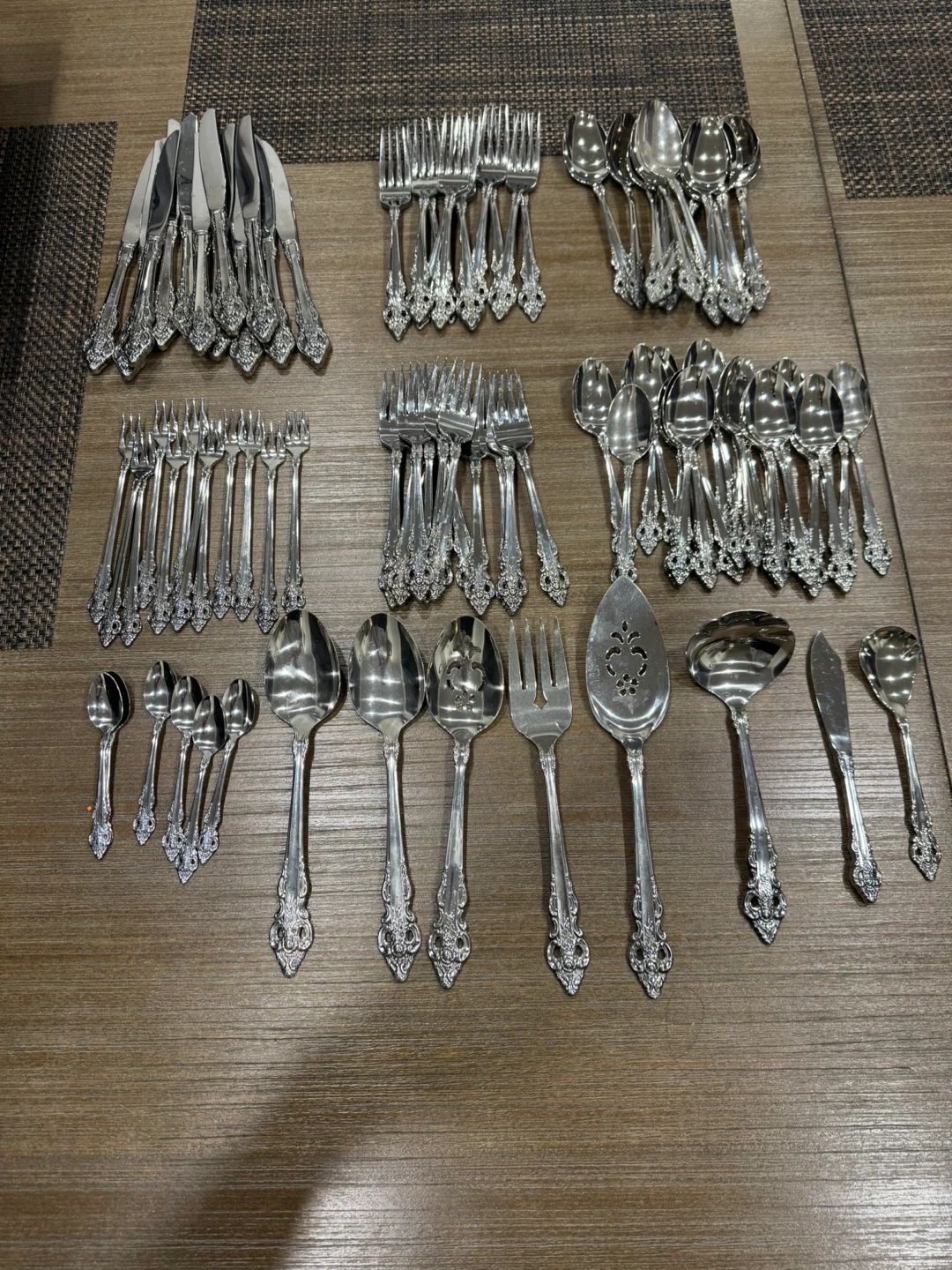 Elegant and unique Michelangelo design Oneida stainless steel flatware. 99 pieces which include: