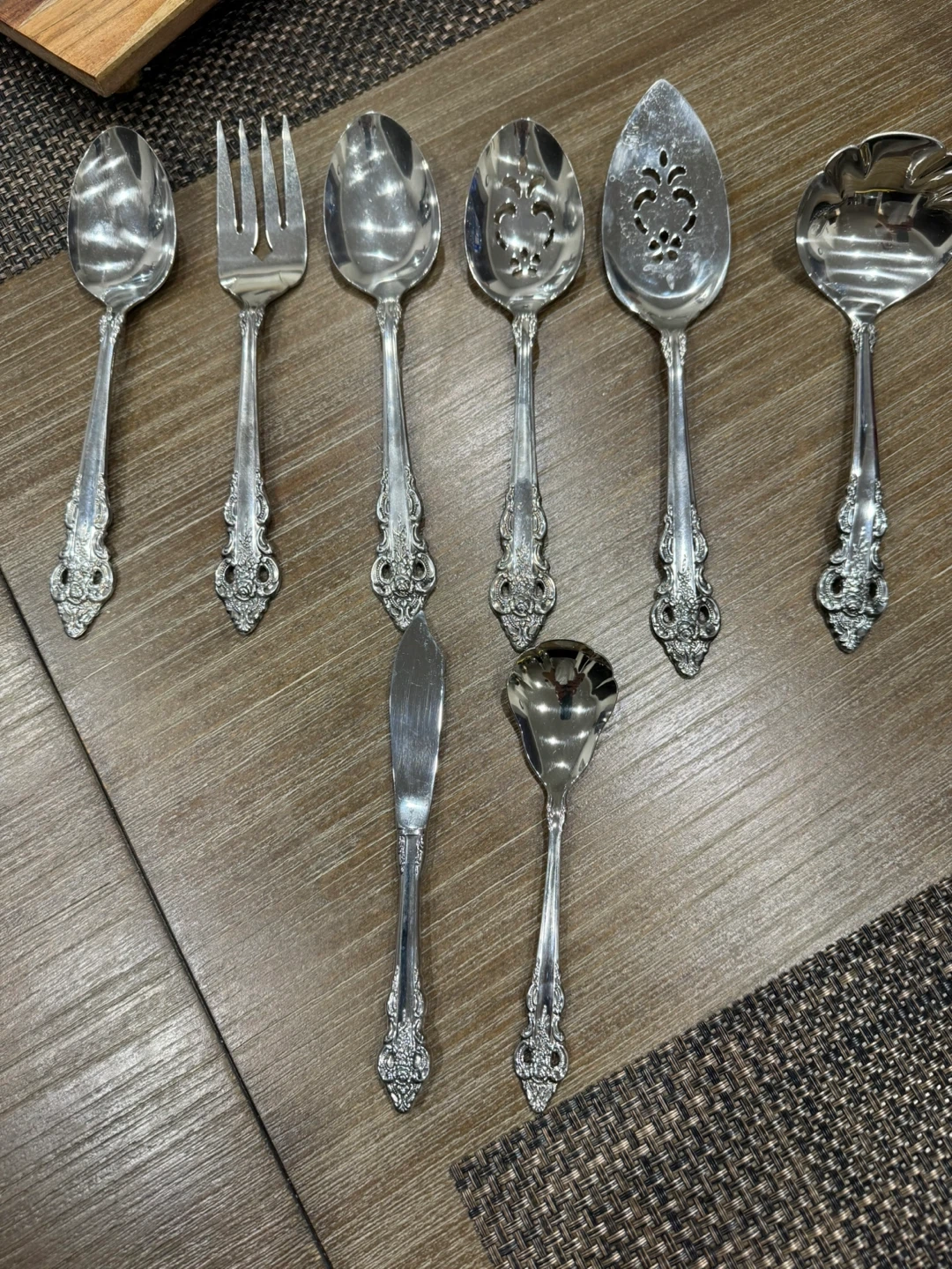 12 Knives; 12 Dinner Forks; 12 Salad Forks; 12 Cocktail Forks;12 Tablespoons; 25 Teaspoons; 6 Espresso Spoons; 2 Solid ServingSpoons; 1 Pierced Serving Spoon; 1 Serving Fork; 1 Sugar Spoon; 1 Butter Knife; 1 Ladle; 1 Spatula.