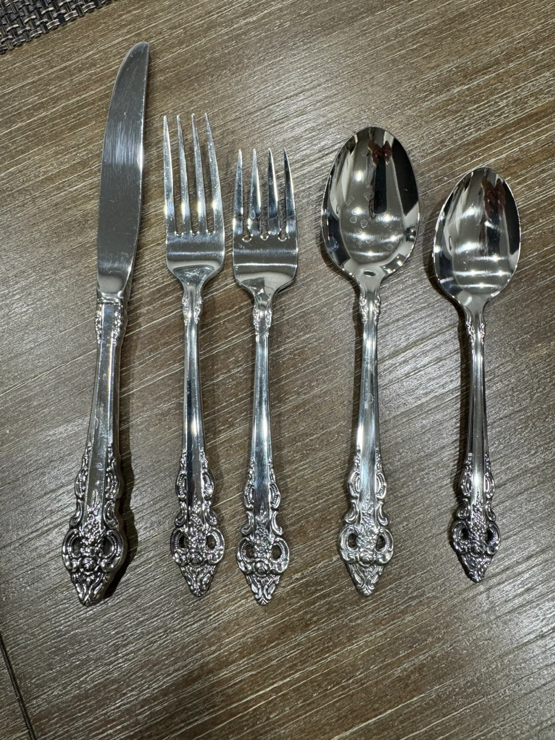 12 Knives; 12 Dinner Forks; 12 Salad Forks; 12 Cocktail Forks;12 Tablespoons; 25 Teaspoons; 6 Espresso Spoons; 2 Solid ServingSpoons; 1 Pierced Serving Spoon; 1 Serving Fork; 1 Sugar Spoon; 1 Butter Knife; 1 Ladle; 1 Spatula.
