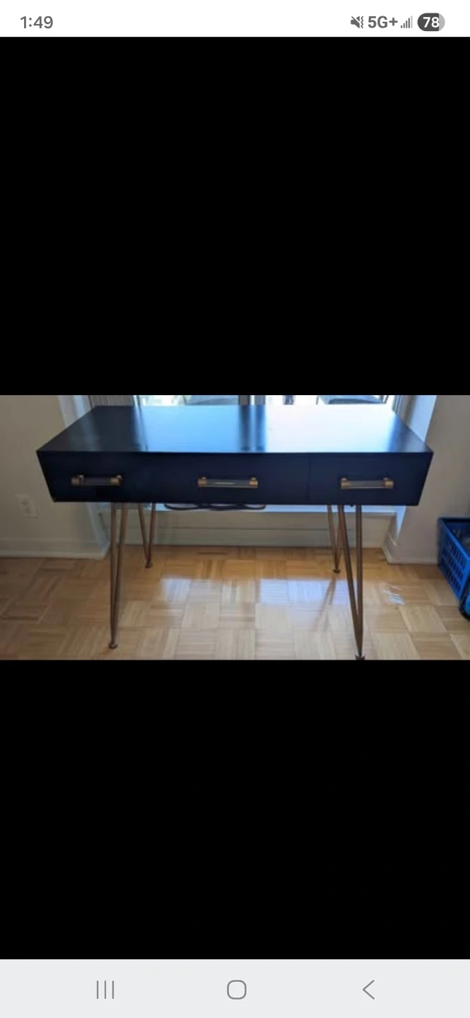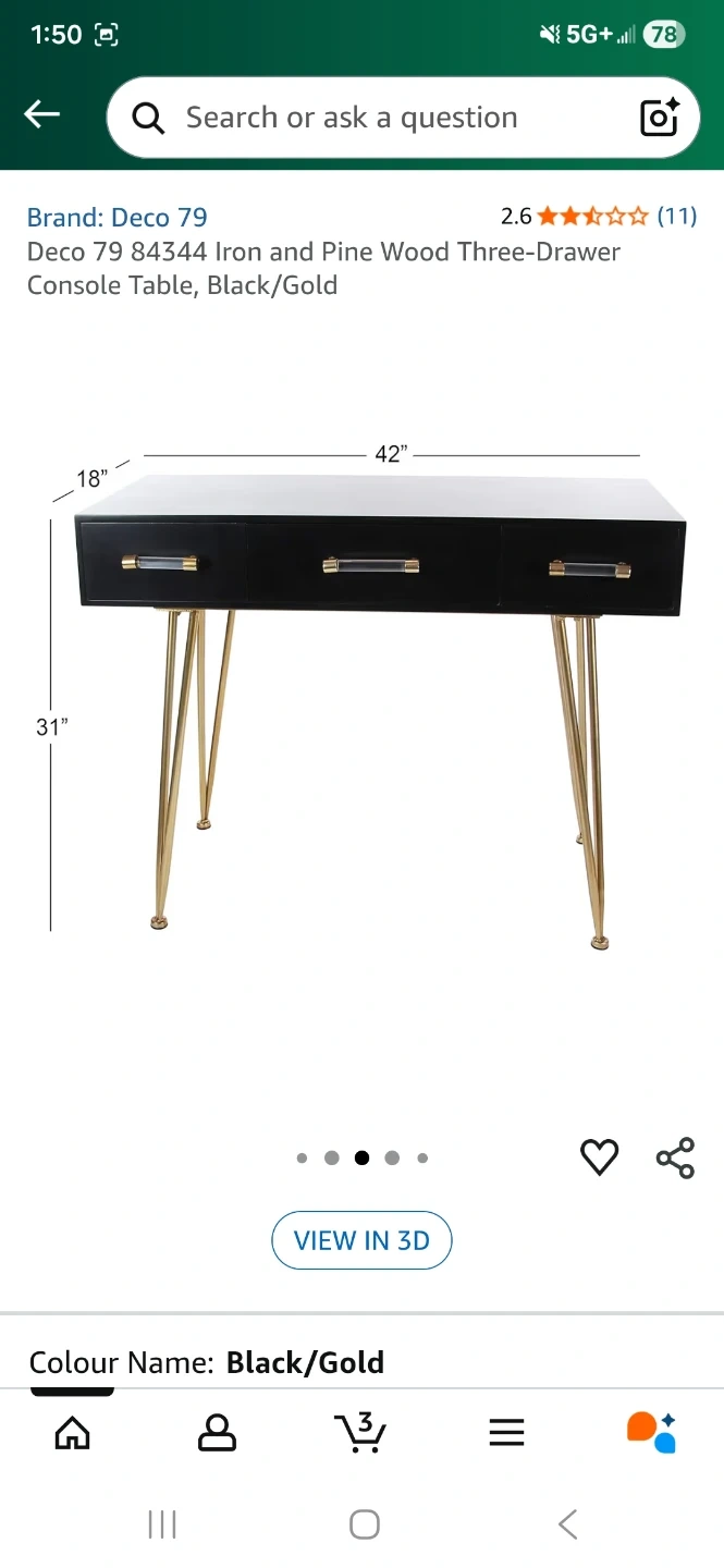 Selling a Deco 79 console table in black and gold! It features a three-drawer design with iron and pine wood construction.